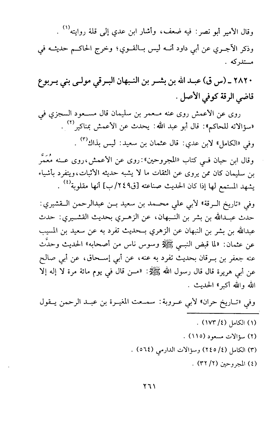 ٢٨٢٠ - (س ق) عبد الله بن بشر بن النبهان البرقي مولى بني يربوع قاضي الرقة كوفي الأصل.