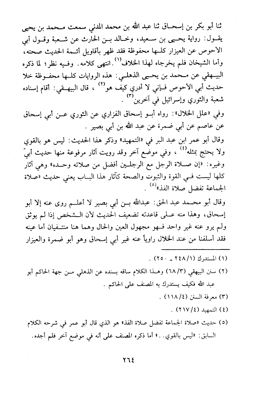 وقال أبو عمر بن عبد البر في " التمهيد " وذكر هذا الحديث: ليس هو بالقوي ولا يحتج بمثله، وفي موضع آخر وقد رويت آثار مرفوعة منها حديث أبي وغيره: " إن صلاة الرجل مع الرجلين أفضل من صلاته وحده " وهي آثار كلها ليست في القوة والثبوت والصحة كآثار هذا الباب يعني حديث " صلاة الجماعة تفضل صلاة الفذ ".