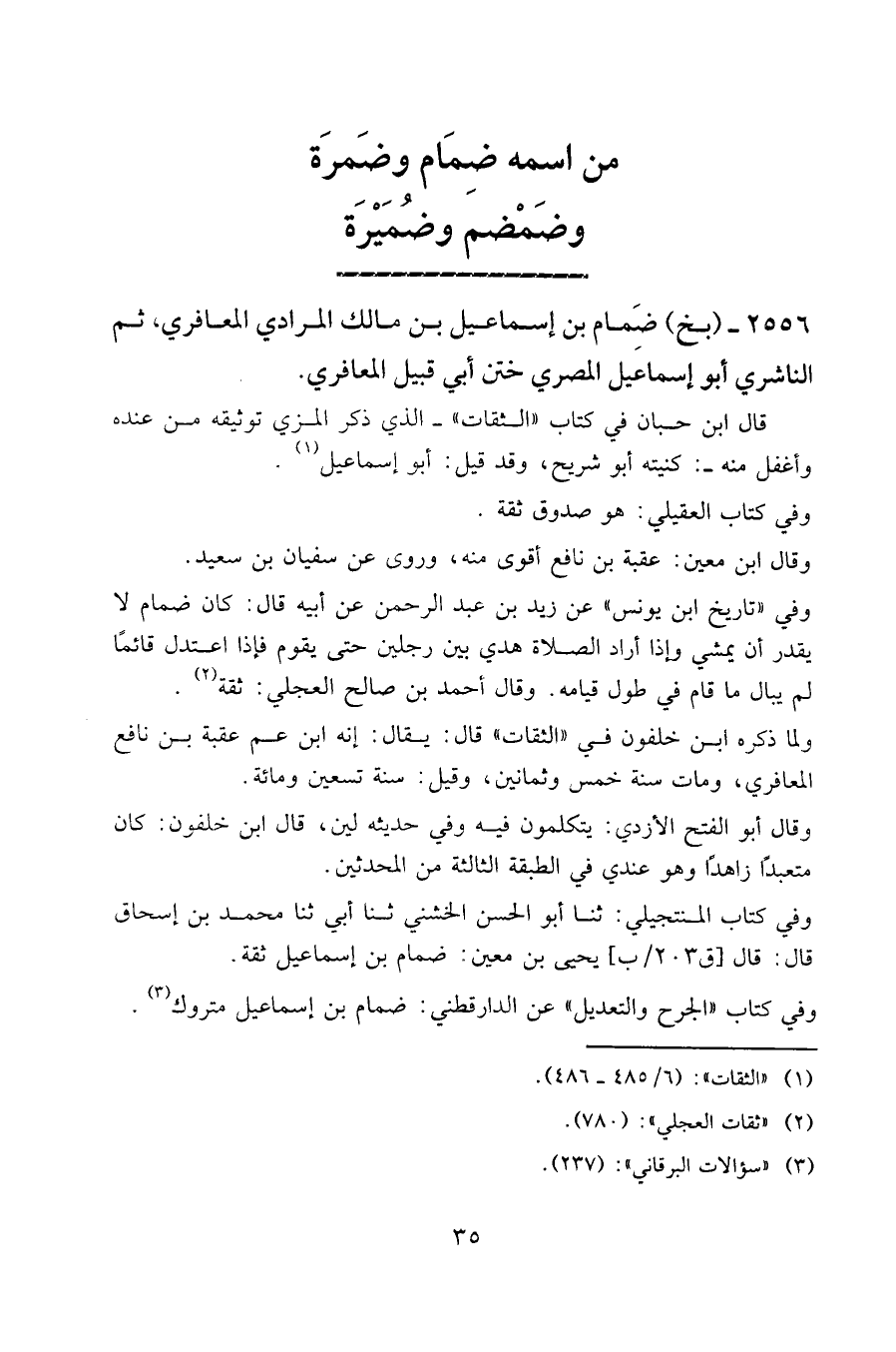 ٢٥٥٦ - (بخ) ضمام بن إسماعيل بن مالك المرادي المعافري، ثم الناشري أبو إسماعيل المصري ختن أبي قبيل المعافري.
