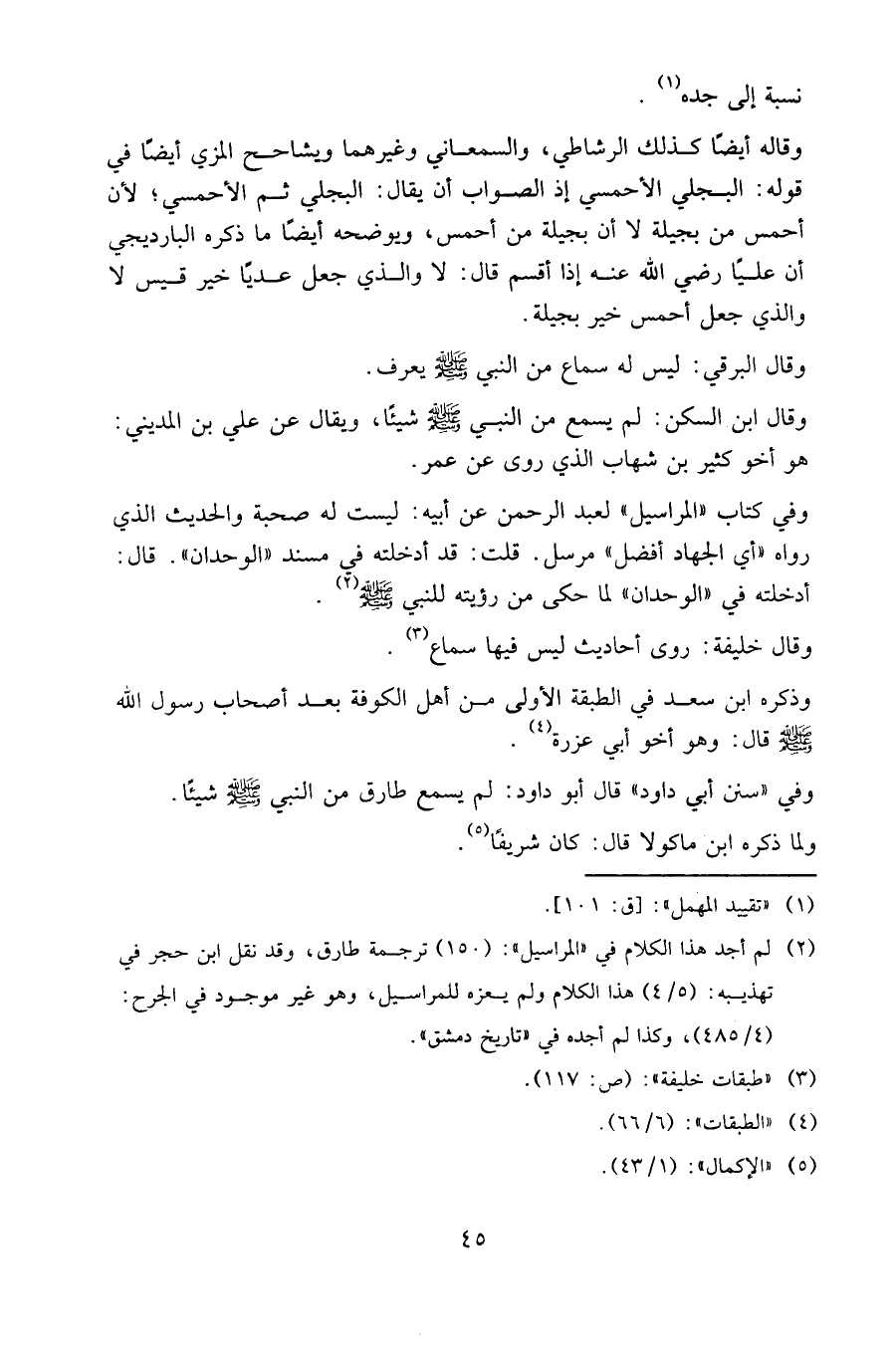 وقال أيضا كذلك الرشاطي، والسمعاني وغيرهما ويشاحح المزي أيضا في قوله: البجلي الأحمسي إذ الصواب أن يقال: البجلي ثم الأحمسي؛ لأن أحمس من بجيلة لا أن بجيلة من أحمس، ويوضحه أيضا ما ذكره البارديجي أن عليا رضي الله عنه إذا أقسم قال: لا والذي جعل عديا خير قيس لا والذي جعل أحمس خير بجيلة.