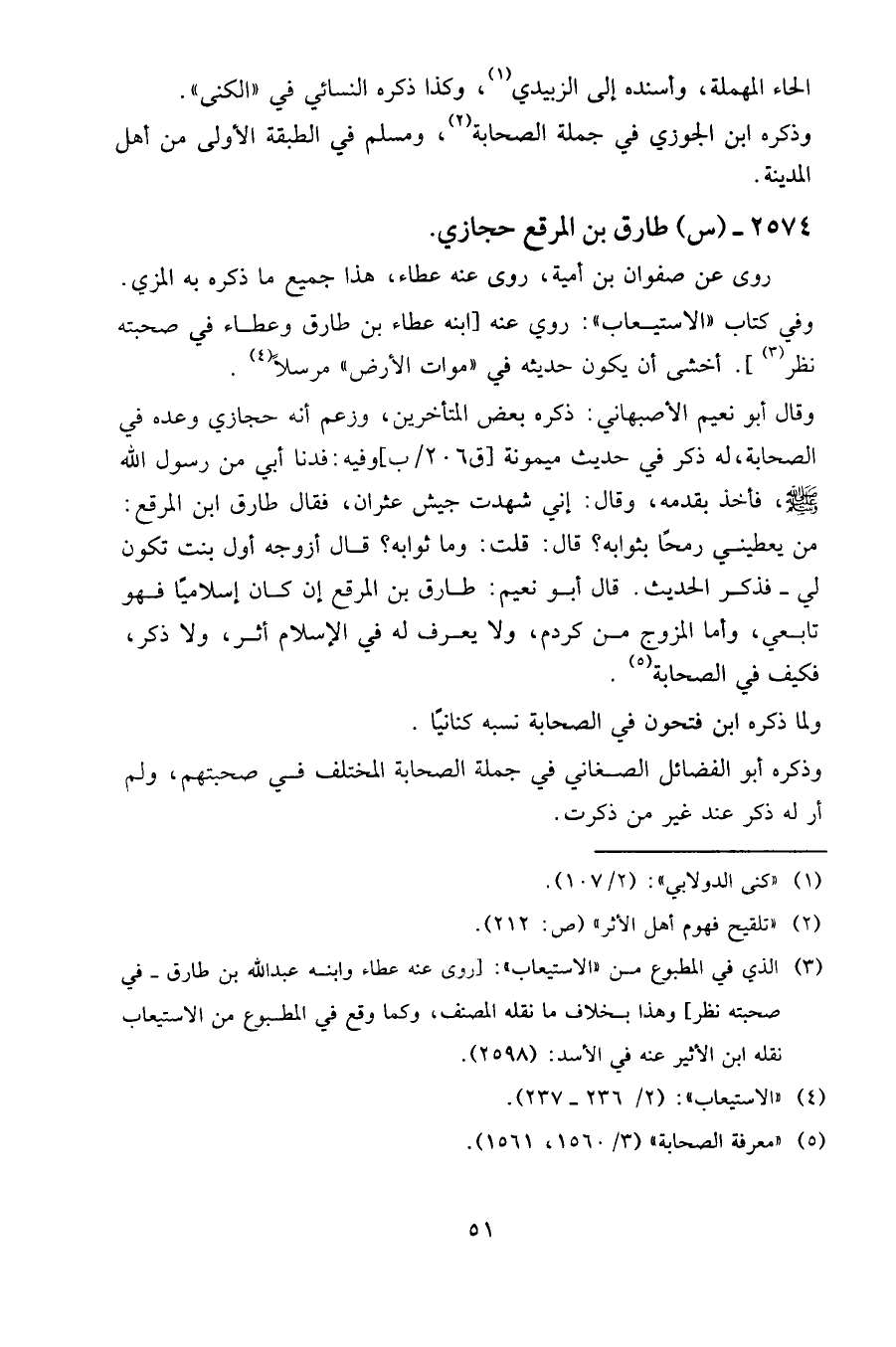 وقال أبو نعيم الأصبهاني: ذكره بعض المتأخرين، وزعم أنه حجازي وعده في الصحابة، له ذكر في حديث ميمونة [ق ٢٠٦/ب] وفيه: فدنا أبي من رسول الله صلى الله عليه وسلم، فأخذ بقدمه، وقال: إني شهدت جيش عثران، فقال طارق بن المرقع: من يعطيني رمحا بثوابه؟ قال: قلت: وما ثوابه؟ قال أزوجه أول بنت تكون لي - فذكر الحديث. قال أبو نعيم: طارق بن المرقع إن كان إسلاميا فهو تابعي، وأما المزوج من كردم، ولا يعرف له في الإسلام أثر، ولا ذكر، فكيف في الصحابة.