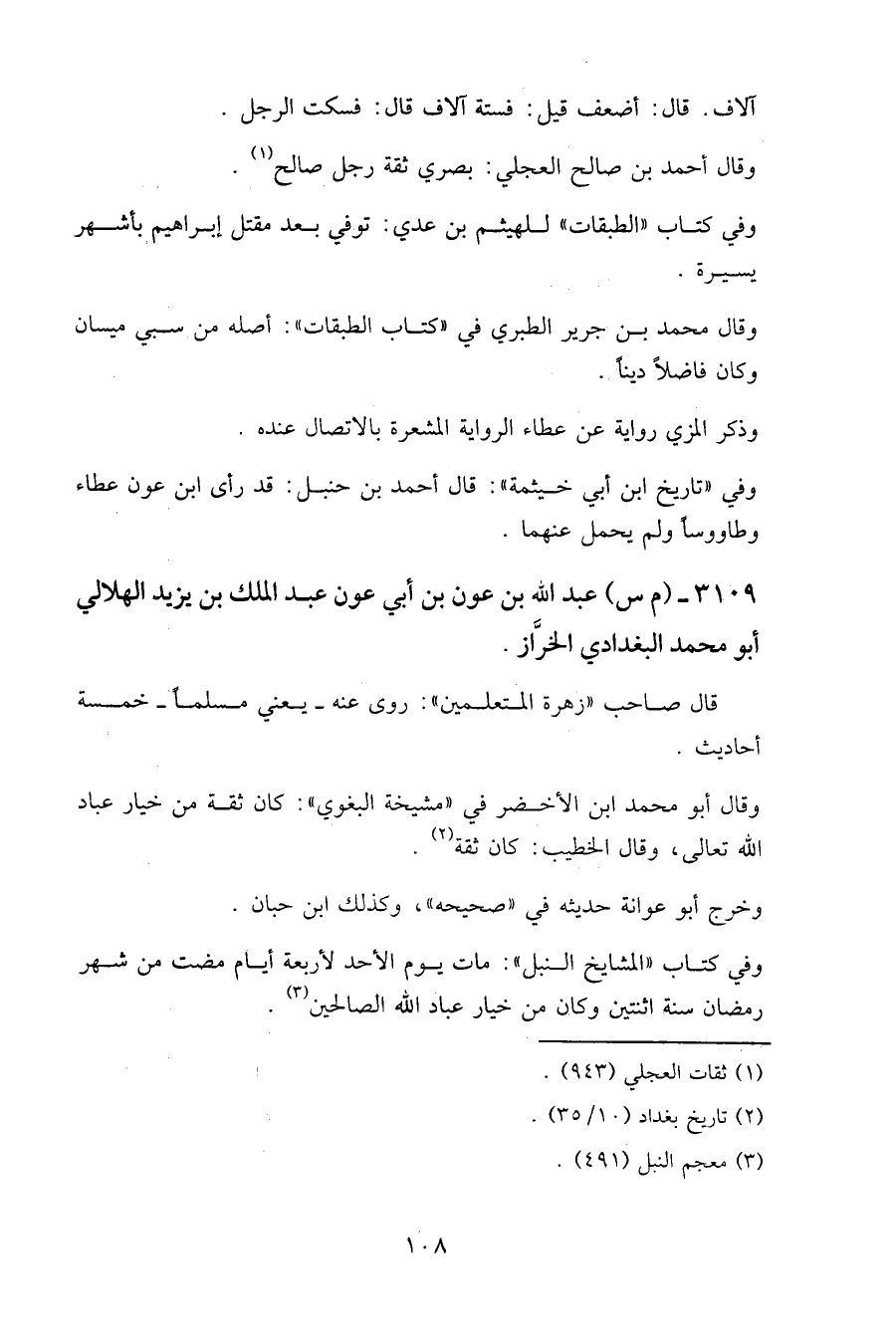٣١٠٩ - (م س) عبد الله بن عون بن أبي عون عبد الملك بن يزيد الهلالي أبو محمد البغدادي الخراز.