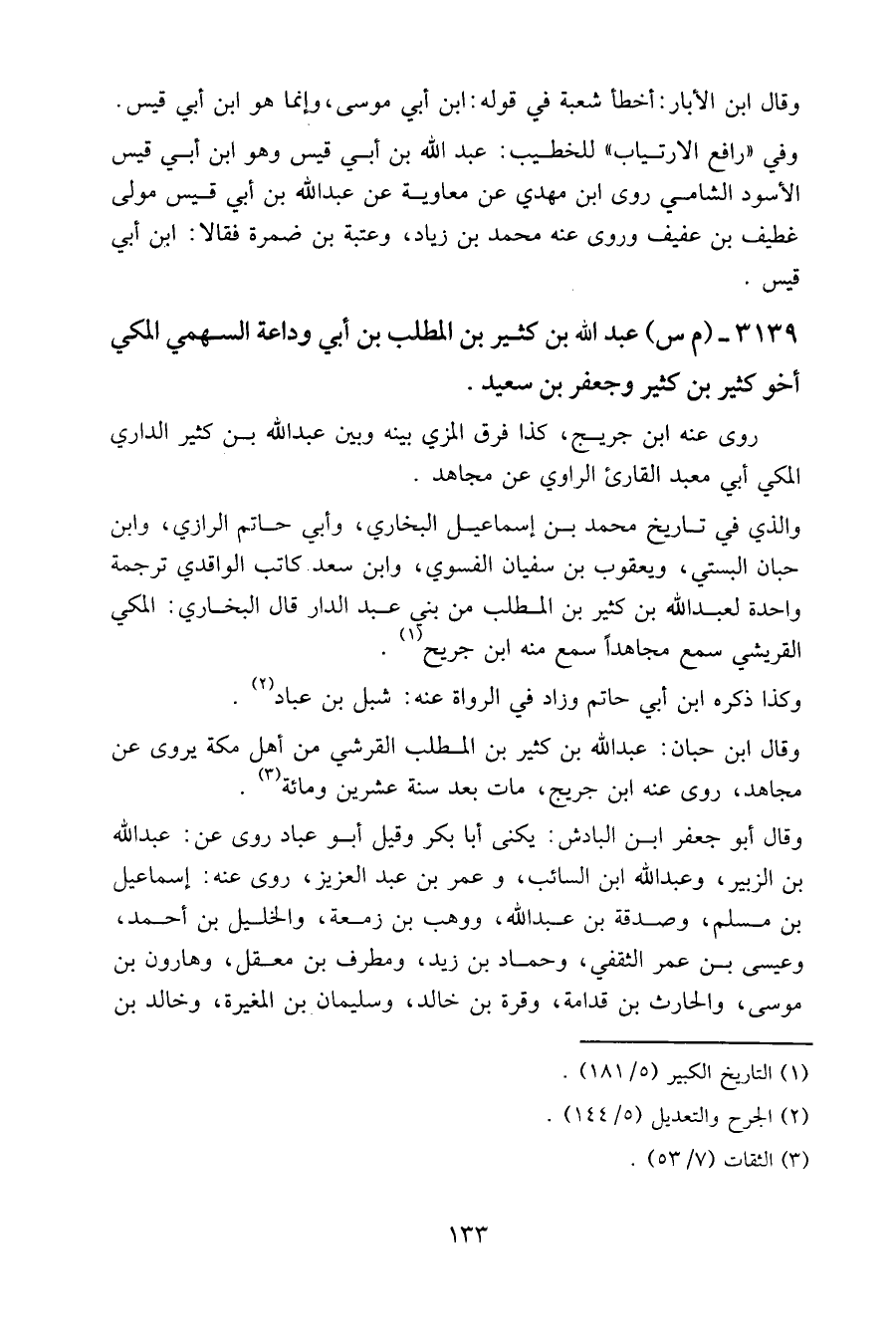 والذي في تاريخ محمد بن إسماعيل البخاري، وأبي حاتم الرازي، وابن حبان البستي، ويعقوب بن سفيان الفسوي، وابن سعد كاتب الواقدي ترجمة واحدة لعبد الله بن كثير بن المطلب من بني عبد الدار قال البخاري: المكي القريشي سمع مجاهدا سمع منه ابن جريح.