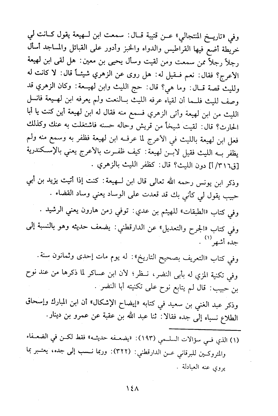 وفي " تاريخ المنتجالي " عن قتيبة قال: سمعت ابن لهيعة يقول كانت لي خريطة أضع فيها القراطيس والدواة والخبز وأدور على القبائل والمساجد أسأل رجلا رجلا ممن سمعت ومن لقيت وسأل يحيى بن معين: هل لقي ابن لهيعة الأعرج؟ فقال: نعم فقيل له: هل روى عن الزهري شيئا قال: لا كانت له ولليث قصة قال: وما هي؟ قال: حج الليث وابن لهيعة: وكان الزهري قد وصف لليث فلما أن لقياه عرفه الليث بالنعت ولم يعرفه ابن لهيعة فانسل الليث من ابن لهيعة وأتى الزهري فسمع منه فقال له ابن لهيعة أين كنت يا أبا الحارث؟ قال: لقيت شيخا من قريش وحاله حسنة فاشتغلت به عنك وكذلك فعل ابن لهيعة بالليث في الأعرج لما عرفه ابن لهيعة فظفر به وسمع منه ولم يظفر به الليث فقيل لابن لهيعة: كيف ظفرت بالأعرج يعني بالإسكندرية [ق٣١٦/أ] دون الليث؟ قال: كظفر الليث بالزهري.