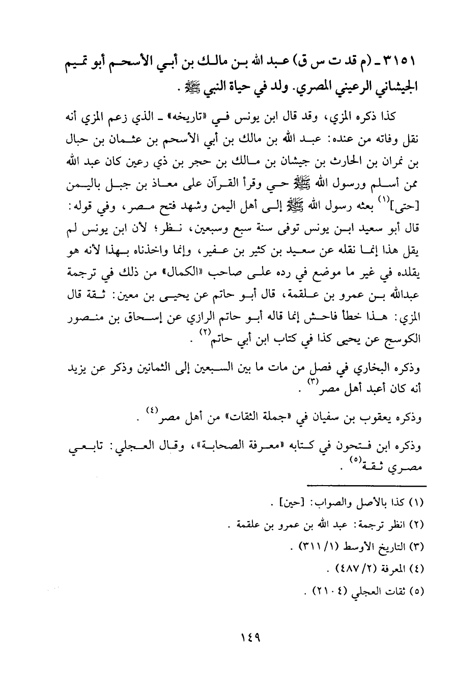 كذا ذكره المزي، وقد قال ابن يونس في " تاريخه " - الذي زعم المزي أنه نقل وفاته من عنده: عبد الله بن مالك بن أبي الأسحم بن عثمان بن حبال بن نمران بن الحارث بن جيشان بن مالك بن حجر بن ذي رعين كان عبد الله ممن أسلم ورسول الله - صلى الله عليه وسلم - حي وقرأ القرآن على معاذ بن جبل باليمن [حتى] بعثه رسول الله - صلى الله عليه وسلم - إلى أهل اليمن وشهد فتح مصر، وفي قوله: قال أبو سعيد ابن يونس توفي سنة سبع وسبعين، نظر؛ لأن ابن يونس لم يقل هذا إنما نقله عن سعيد بن كثير بن عفير، وإنما وأخذناه بهذا لأنه هو يقلده في غير ما موضع في رده على صاحب " الكمال " من ذلك في ترجمة عبد الله بن عمرو بن علقمة، قال أبو حاتم عن يحيى بن معين: ثقة قال المزي: هذا خطأ فاحش إنما قاله أبو حاتم الرازي عن إسحاق بن منصور الكوسج عن يحيى كذا في كتاب ابن أبي حاتم.