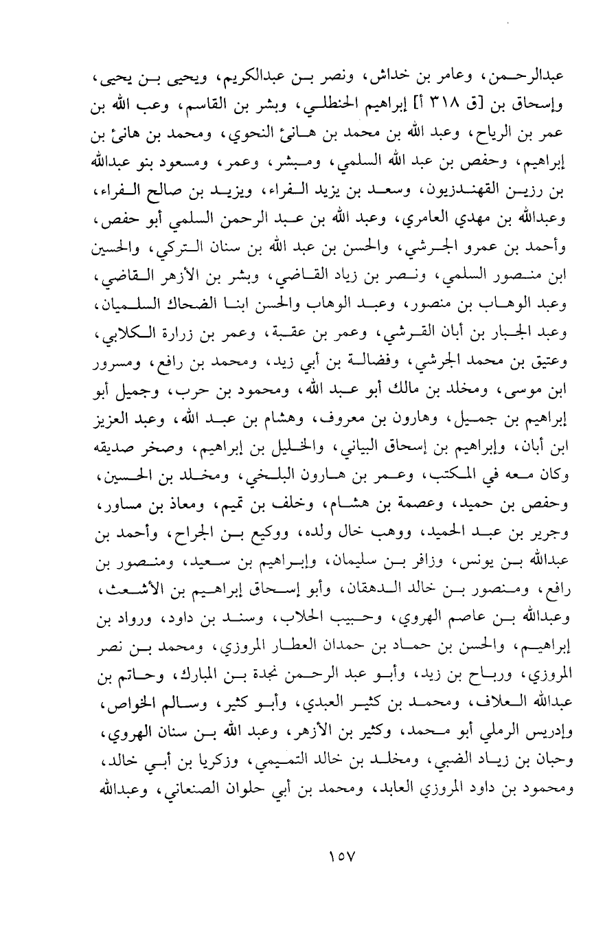 عبد الرحمن، وعامر بن خداش، ونصر بن عبد الكريم، ويحيى بن يحيى، وإسحاق بن [ق ٣١٨أ] إبراهيم الحنطلي، وبشر بن القاسم، وعبد الله بن عمر بن الرياح، وعبد الله بن محمد بن هانئ النحوي، ومحمد بن هانئ بن إبراهيم، وحفص بن عبد الله السلمي، ومبشر، وعمر، ومسعود بنو عبد الله بن رزين القهندزيون، وسعد بن يزيد الفراء، ويزيد بن صالح الفراء، وعبد الله بن مهدي العامري، وعبد الله بن عبد الرحمن السلمي أبو حفص، وأحمد بن عمرو الجرشي، والحسن بن عبد الله بن سنان التركي، والحسين بن منصور السلمي، ونصر بن زياد القاضي، وبشر بن الأزهر القاضي، وعبد الوهاب بن منصور، وعبد الوهاب والحسن ابنا الضحاك السلميان، وعبد الجبار بن أبان القرشي، وعمر بن عقبة، وعمر بن زرارة الكلابي، وعتيق بن محمد الجرشي، وفضالة بن أبي زيد، ومحمد بن رافع، ومسرور بن موسى، ومخلد بن مالك أبو عبد الله، ومحمود بن حرب، وجميل أبو إبراهيم بن جميل، وهارون بن معروف، وهشام بن عبد الله، وعبد العزيز بن أبان، وإبراهيم بن إسحاق البياني، والخليل بن إبراهيم، وصخر صديقه وكان معه في المكتب، عمر بن هارون البلخي، ومخلد بن الحسين، وحفص بن حميد، وعصمة بن هشام، وخلف بن تميم، ومعاذ بن مساور، وجرير بن عبد الحميد، ووهب خال ولده، ووكيع بن الجراح، وأحمد بن عبد الله بن يونس، وزافر بن سليمان، وإبراهيم بن سعيد، ومنصور بن رافع، ومنصور بن خالد الدهقان، وأبو إسحاق إبراهيم بن الأشعث، وعبد الله بن عاصم الهروي، وحبيب الحلاب، وسند بن داود، ورواد بن إبراهيم، والحسن بن حماد بن حمدان العطار المروزي، ومحمد بن نصر المروزي، ورباح بن زيد، وأبو عبد الرحمن نجدة بن المبارك، وحاتم بن عبد الله العلاف، ومحمد بن كثير العبدي، وأبو كثير، وسالم الخواص، وإدريس الرملي أبو محمد، وكثير بن الأزهر، وعبد الله بن سنان الهروي، وحبان بن زياد الضبي، ومخلد بن خالد التميمي، و زكريا بن أبي خالد، ومحمود بن داود المروزي العابد، ومحمد بن أبي حلوان الصنعاني، وعبد الله