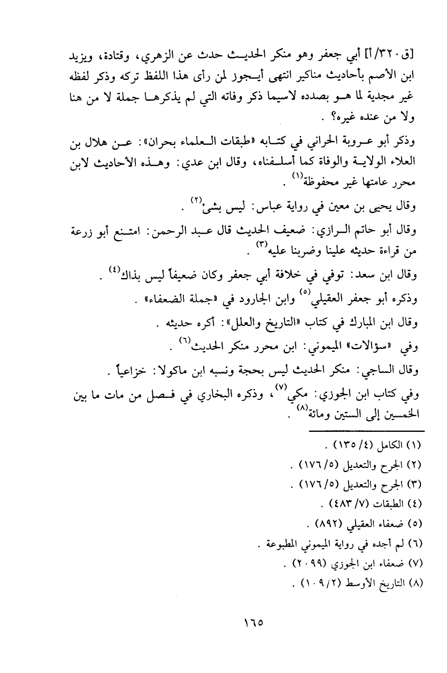 [ق٣٢٠/أ] أبي جعفر وهو منكر الحديث حدث عن الزهري، وقتادة، ويزيد بن الأصم بأحاديث مناكير انتهى أيجوز لمن رأى هذا اللفظ تركه وذكر لفظه غير مجدية لما هو بصدده لا سيما ذكر وفاته التي لم يذكرها جملة لا من هنا ولا من عنده غيره؟