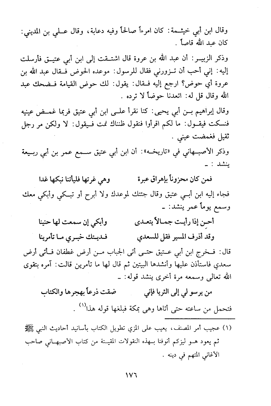 وذكر الزبير: أن عبد الله بن عروة قال اشتقت إلى ابن أبي عتيق فأرسلت إليه: إني أحب أن تزورني فقال للرسول: موعده الحوض فقال عبد الله بن عروة أي حوض؟ ارجع إليه فقال: يقول: لك حوض القيامة فضحك عبد الله وقال قل له: أتعدنا حوضا لا ترده.
