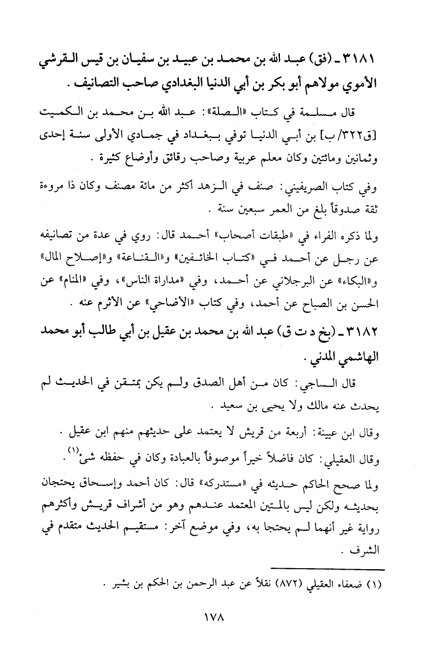 ٣١٨١ - (فق) عبد الله بن محمد بن عبيد بن سفيان بن قيس القرشي الأموي مولاهم أبو بكر بن أبي الدنيا البغدادي صاحب التصانيف.
