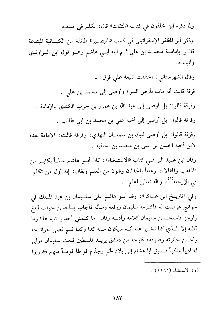 وقال ابن عبد البر في كتاب " الاستغناء ": كان أبو هاشم عالما بكثير من المذاهب والمقالات وعالما بالحدثان وفنون من العلم ويقال: إنه أول من تكلم في الإرجاء، والله تعالى أعلم.