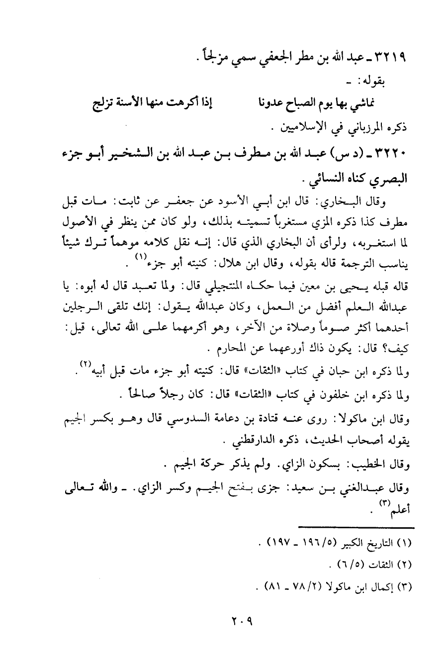 ٣٢١٩ - عبد الله بن مطر الجعفي سمي مزلجا.