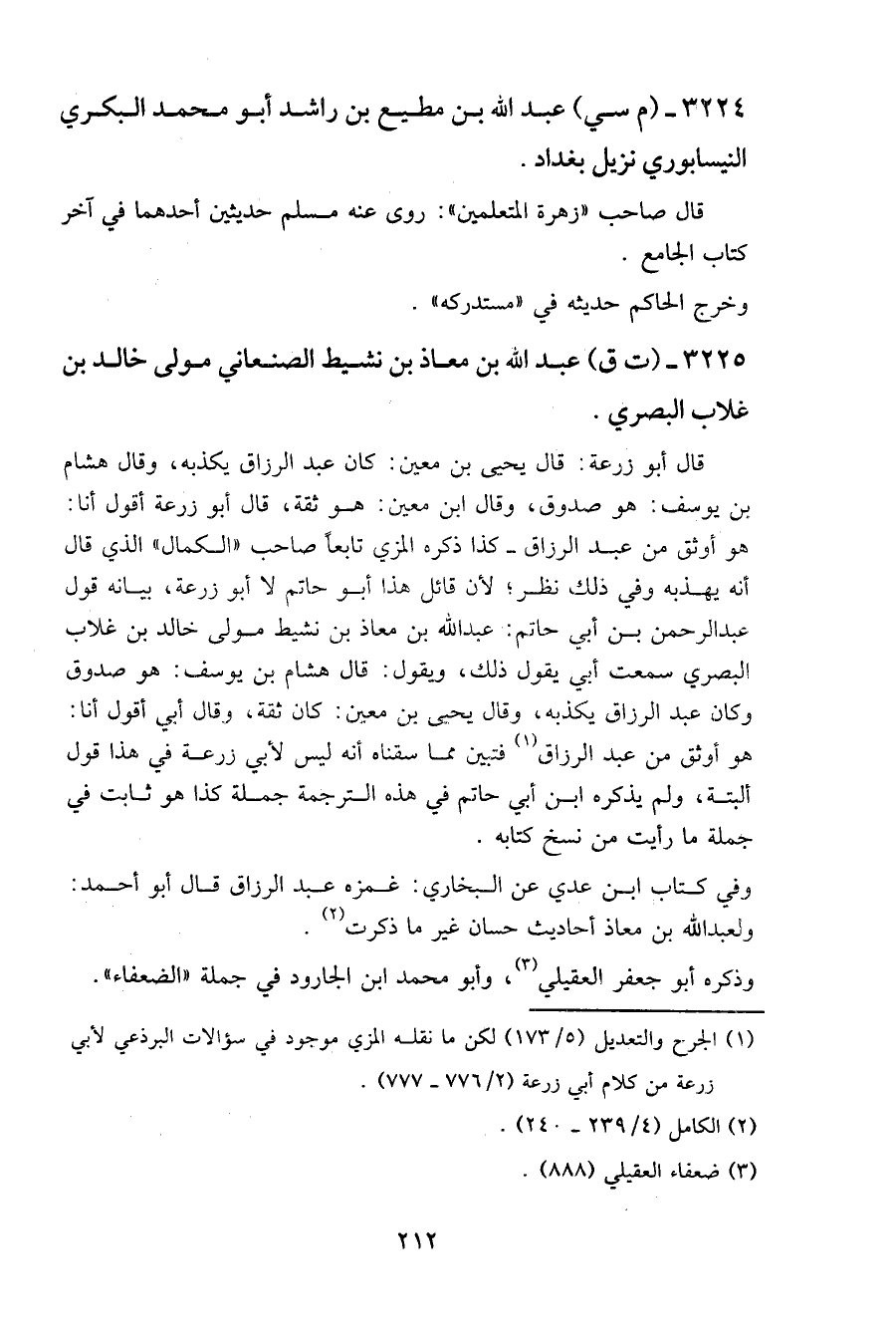 قال أبو زرعة: قال يحيى بن معين: كان عبد الرزاق يكذبه، وقال هشام بن يوسف: هو صدوق، وقال ابن معين: هو ثقة، قال أبو زرعة أقول أنا: هو أوثق من عبد الرزاق - كذا ذكره المزي تابعا صاحب " الكمال " الذي قال إنه يهذبه وفي ذلك نظر؛ لأن قائل هذا أبو حاتم لا أبو زرعة، بيانه قول عبد الرحمن بن أبي حاتم: عبد الله بن معاذ بن نشيط مولى خالد بن غلاب البصري سمعت أبي يقول ذلك، ويقول: قال هشام بن يوسف: هو صدوق وكان عبد الرزاق يكذبه، وقال يحيى بن معين: كان ثقة، وقال أبي أقول أنا: هو أوثق من عبد الرزاق فتبين مما سقناه أنه ليس لأبي زرعة في هذا قول ألبتة، ولم يذكره ابن أبي حاتم في هذه الترجمة جملة كذا هو ثابت في جملة ما رأيت من نسخ كتابه.