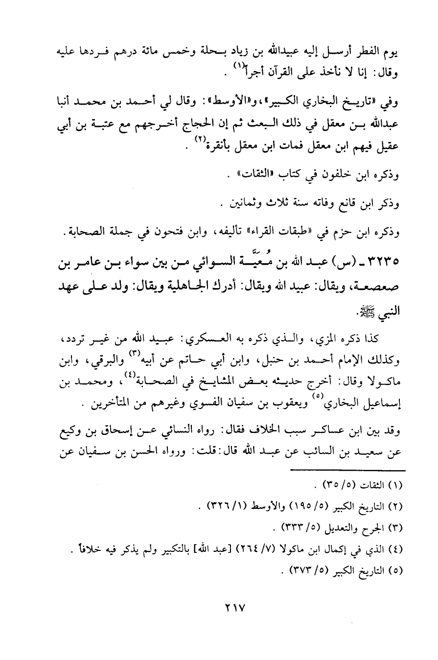 ٣٢٣٥ - (س) عبد الله بن معية السوائي من بين سواء بن عامر بن صعصعة، ويقال: عبيد الله ويقال: أدرك الجاهلية ويقال: ولد على عهد النبي - صلى الله عليه وسلم -.