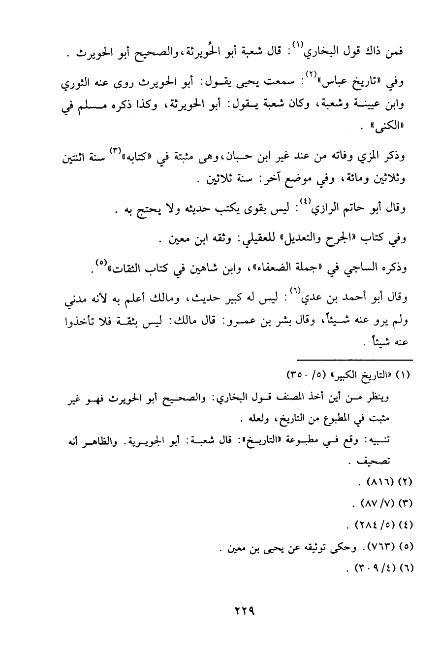 فمن ذاك قول البخاري: قال شعبة أبو الحويرثة، والصحيح أبو الحويرث.