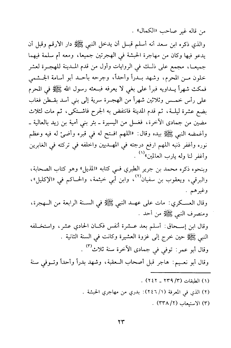 وقال ابن إسحاق: أسلم بعد عشرة أنفس فكان الحادي عشر، واستخلفه النبي - صلى الله عليه وسلم - حين خرج إلى غزوة العشيرة وكانت في السنة الثانية.