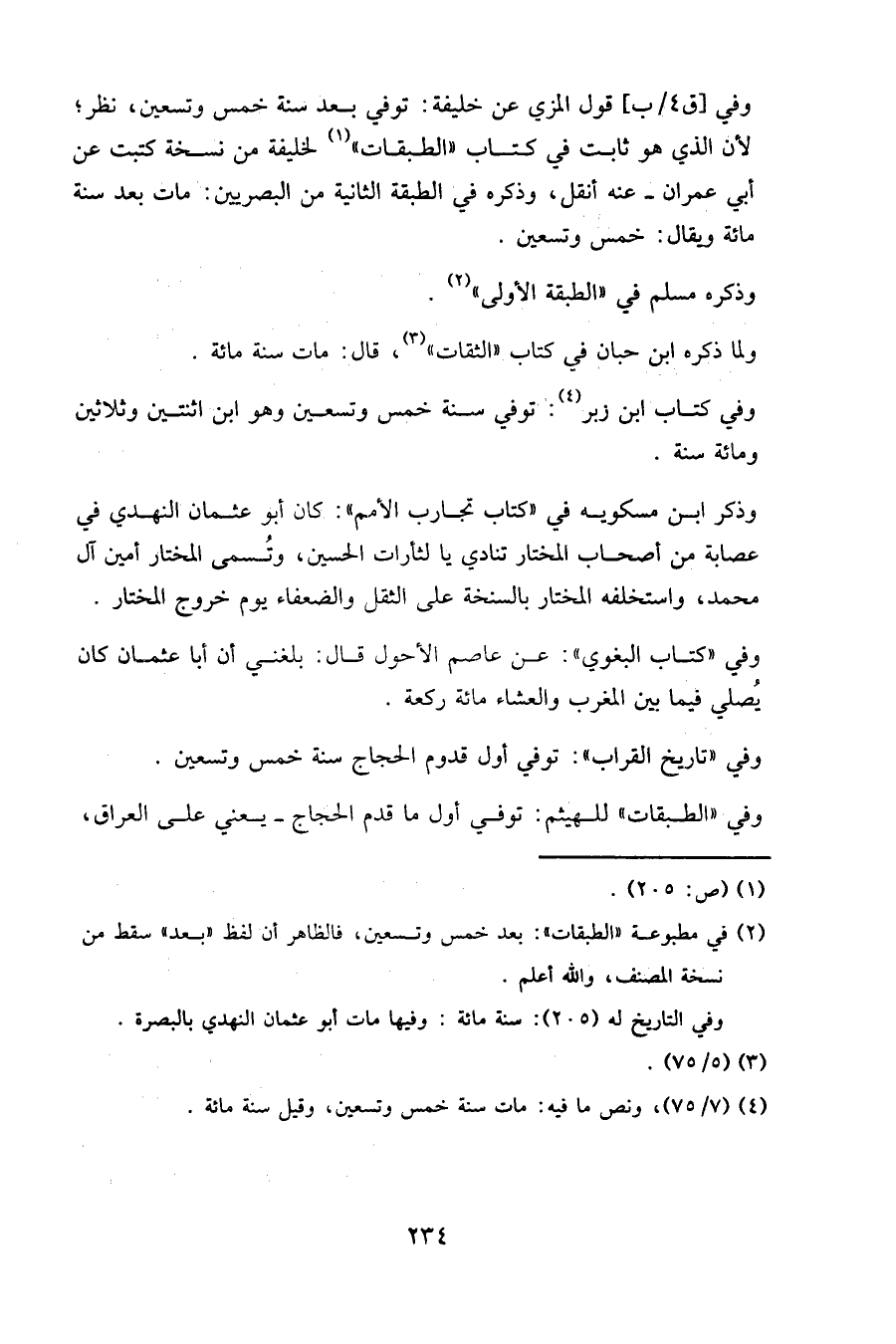 وفي [ق٤/ب] قول المزي عن خليفة: توفي بعد سنة خمس وتسعين، نظر؛ لأن الذي هو ثابت في كتاب " الطبقات " لخليفة من نسخة كتبت عن أبي عمران - عنه أنقل، وذكره في الطبقة الثانية من البصريين: مات بعد سنة مائة ويقال: خمس وتسعين.