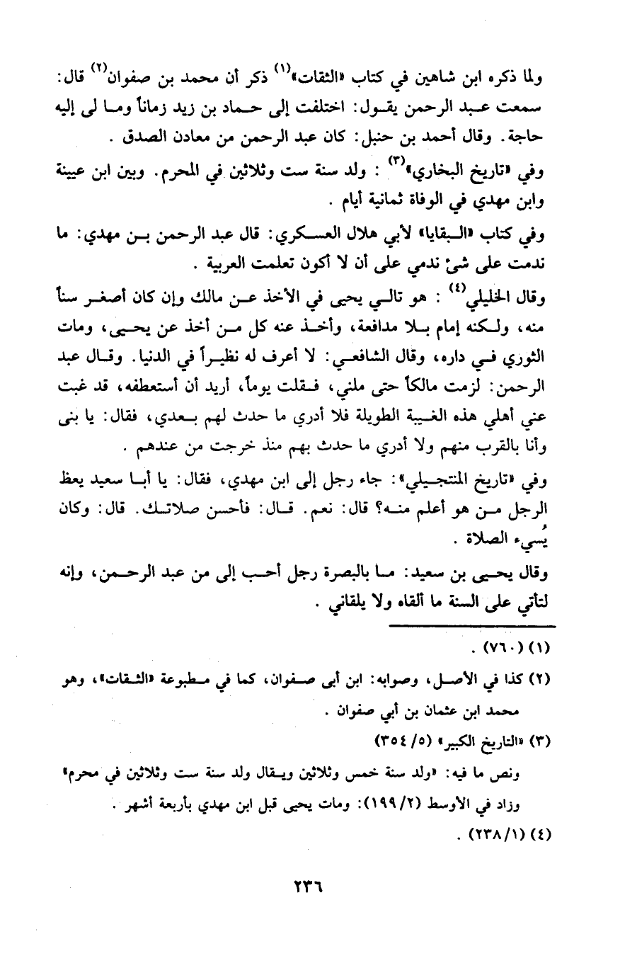 ولما ذكره ابن شاهين في كتاب " الثقات " ذكر أن محمد بن صفوان قال: سمعت عبد الرحمن يقول: اختلفت إلى حماد بن زيد زمانا وما لي إليه حاجة. وقال أحمد بن حنبل: كان عبد الرحمن من معادن الصدق.