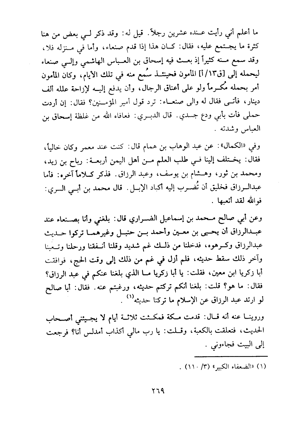 وعن أبي صالح محمد بن إسماعيل الضراري قال: بلغني وأنا بصنعاء عند عبد الرزاق أن يحيى بن معين وأحمد بن حنبل وغيرهما تركوا حديث عبد الرزاق وكرهوه، فدخلنا من ذلك غم شديد وقلنا أنفقنا ورحلنا وتعبنا وآخر ذلك سقط حديثه، فلم أزل في غم من ذلك إلى وقت الحج، فوافقت أبا زكريا ابن معين، فقلت: يا أبا زكريا ما الذي بلغنا عنكم في عبد الرزاق؟ فقال: ما هو؟ قلت: بلغنا أنكم تركتم حديثه، ورغبتم عنه. فقال: أبا صالح لو ارتد عبد الرزاق عن الإسلام ما تركنا حديثه.