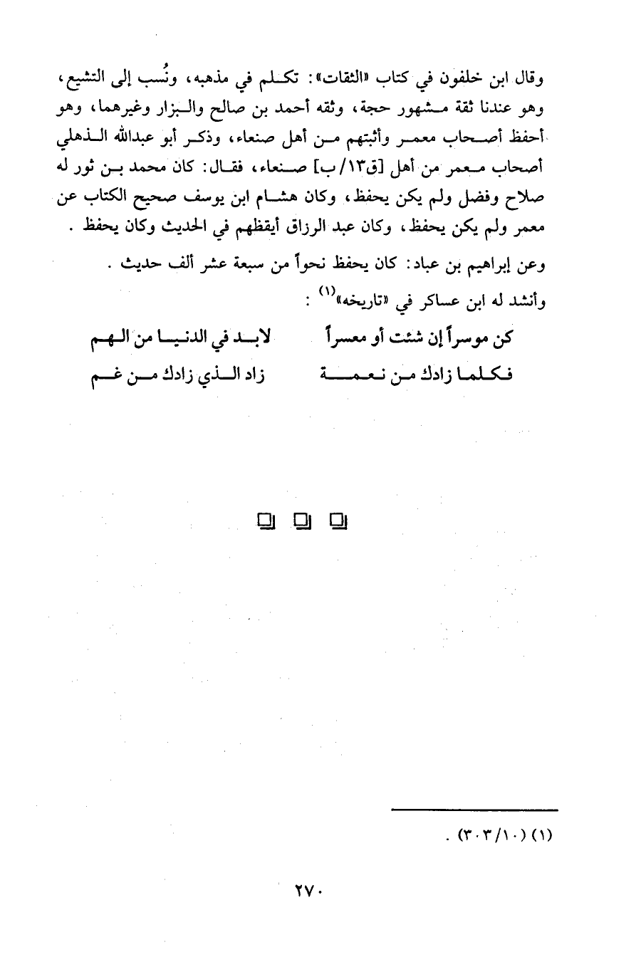وقال ابن خلفون في كتاب " الثقات ": تكلم في مذهبه، ونسب إلى التشيع، وهو عندنا ثقة مشهور حجة، وثقه أحمد بن صالح والبزار وغيرهما، وهو أحفظ أصحاب معمر وأثبتهم من أهل صنعاء، وذكر أبو عبد الله الذهلي أصحاب معمر من أهل [ق١٣/ب] صنعاء، فقال: كان محمد بن ثور له صلاح وفضل ولم يكن يحفظ، وكان هشام ابن يوسف صحيح الكتاب عن معمر ولم يكن يحفظ، وكان عبد الرزاق أيقظهم في الحديث وكان يحفظ.