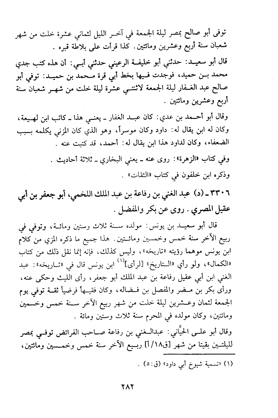 وقال أبو علي الحياني: عبد الغني بن رفاعة صاحب الفرائض توفي بمصر لليلتين بقيتا من شهر [ق ١٨/أ] ربيع الآخر سنة خمس وخمسين ومائتين،