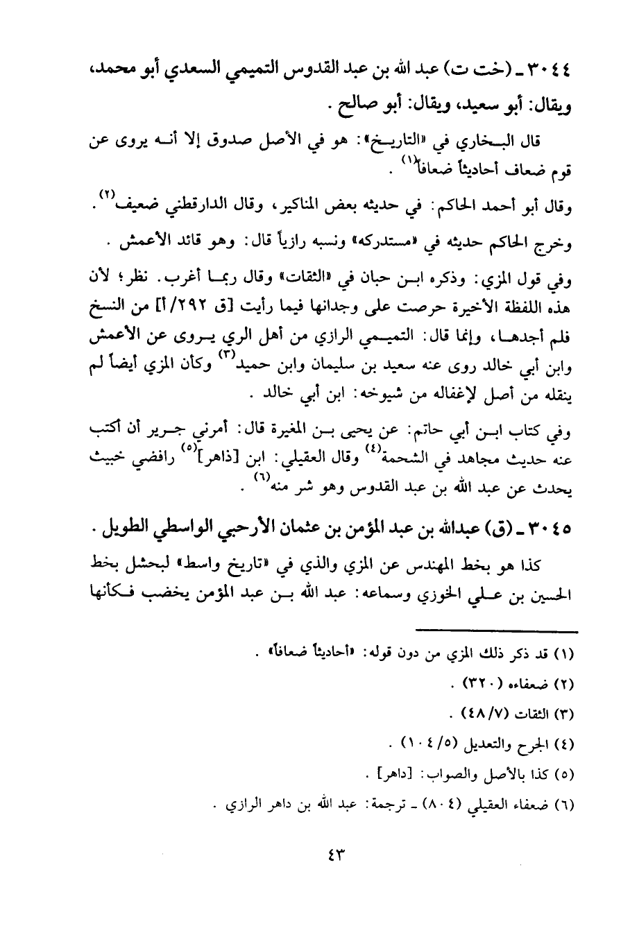 ٣٠٤٤ - (خت ت) عبد الله بن عبد القدوس التميمي السعدي أبو محمد، ويقال: أبو سعيد، ويقال: أبو صالح.