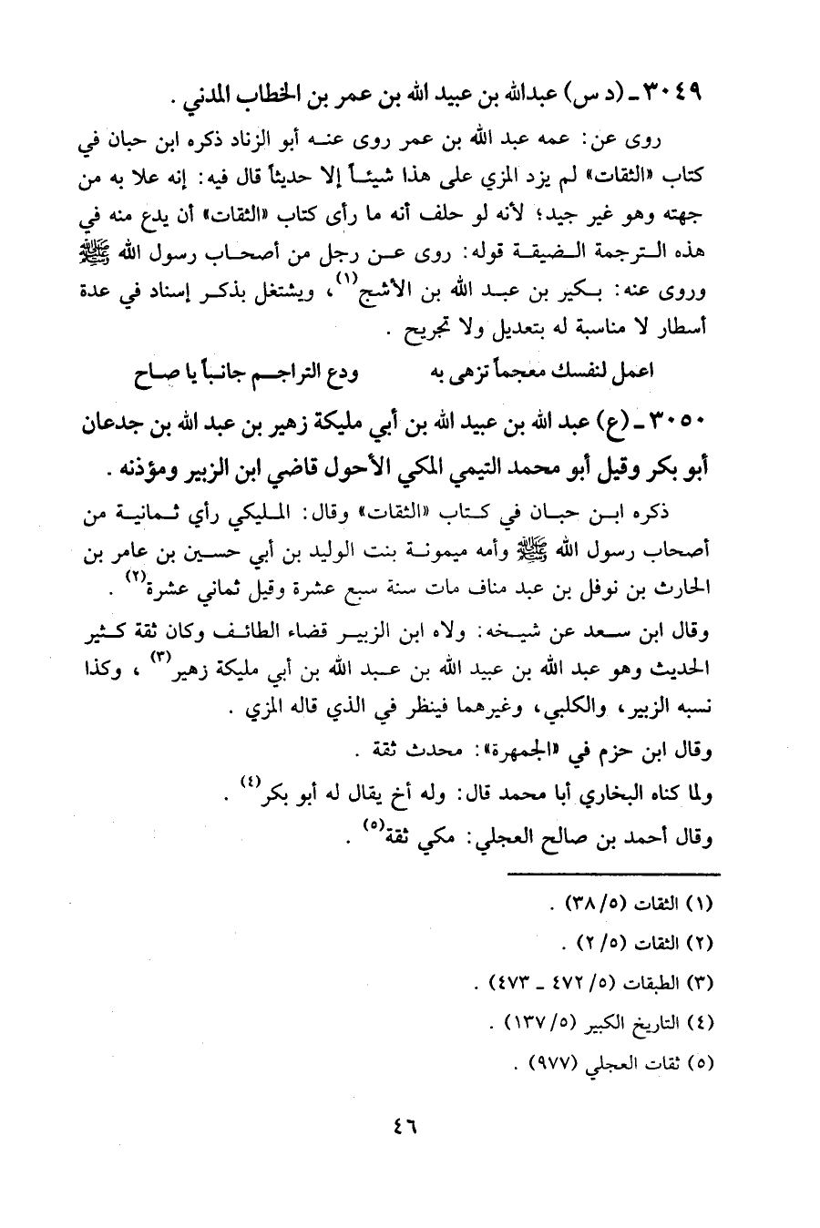 روى عن: عمه عبد الله بن عمر روى عنه أبو الزناد ذكره ابن حبان في كتاب " الثقات " لم يزد المزي على هذا شيئا إلا حديثا قال فيه: إنه علا به من جهته وهو غير جيد؛ لأنه لو حلف أنه ما رأى كتاب " الثقات " أن يدع منه في هذه الترجمة الضيقة قوله: روى عن رجل من أصحاب رسول الله - صلى الله عليه وسلم - وروى عنه: بكير بن عبد الله بن الأشج، ويشتغل بذكر إسناد في عدة أسطار لا مناسبة له بتعديل ولا تجريح.