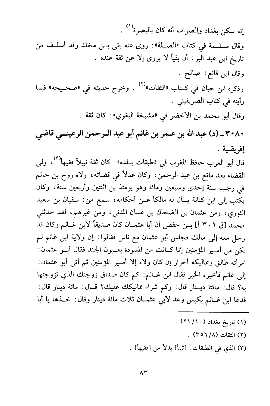 ٣٠٨٠ - (د) عبد الله بن عمر بن غانم أبو عبد الرحمن الرعيني قاضي إفريقية.