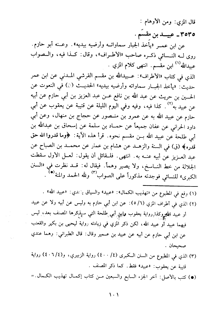 الذي في كتاب " الأطراف ": عبيد الله بن مقسم القرشي المدني عن ابن عمر حديث: " يأخذ الجبار سماواته وأرضيه بيديه " الحديث (ن) في النعوت عن الحسين بن حريث، عن عبد الله بن نافع، عن عبد العزيز بن أبي حازم، عن أبيه، عن عبيد به. كذا فيه، وفيه وفي اليوم الليلة عن قتيبة عن يعقوب عن أبي حازم عن عبيد الله به عن عمرو بن منصور عن حجاج بن منهال، وعن أبي داود الحراني، عن عفان، جميعا عن حماد بن سلمة، عن إسحاق بن عبد الله بن أبي طلحة، عن عبيد الله بن مقسم، نحوه. قرأ هذه الآية: {وما قدروا الله حق قدره} (ق) في السنة والزهد عن هشام بن عمار عن محمد بن الصباح عن عبد العزيز عن أبيه، عنه، به. انتهى. فلقائل أن يقول: لعل الأول سقطت الجلالة من خط الناسخ، ولا يصير وهما. فيقال له: قد نظرت في " السنن الكبرى " للنسائي فوجدته مذكورا على الصواب ولله الحمد والمنة.