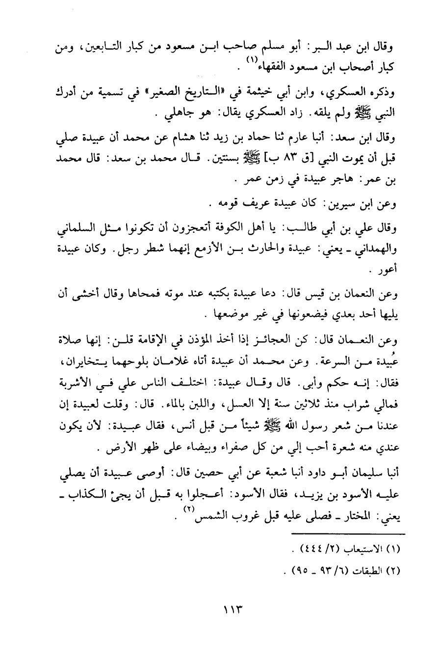 وقال ابن سعد: أنبا عارم، ثنا حماد بن زيد، ثنا هشام، عن محمد، أن عبيدة صلى قبل أن يموت النبي [ق ٨٣ / ب]- صلى الله عليه وسلم - بسنتين. قال محمد بن سعد: قال محمد بن عمر: هاجر عبيدة في زمن عمر.