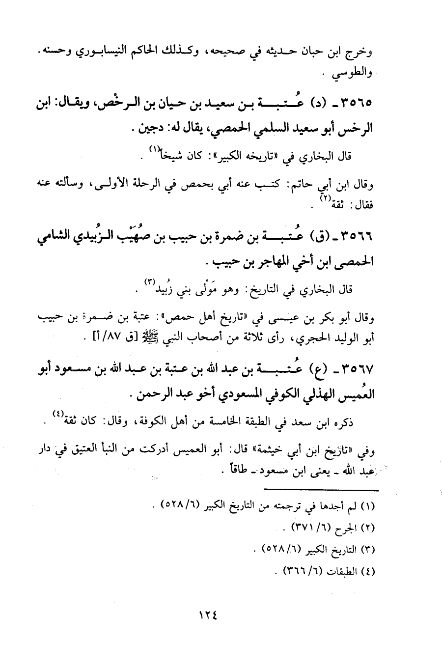 وقال أبو بكر بن عيسى في " تاريخ أهل حمص ": عتبة بن ضمرة بن حبيب أبو الوليد الحجري، رأى ثلاثة من أصحاب النبي - صلى الله عليه وسلم -[ق ٨٧ / أ].