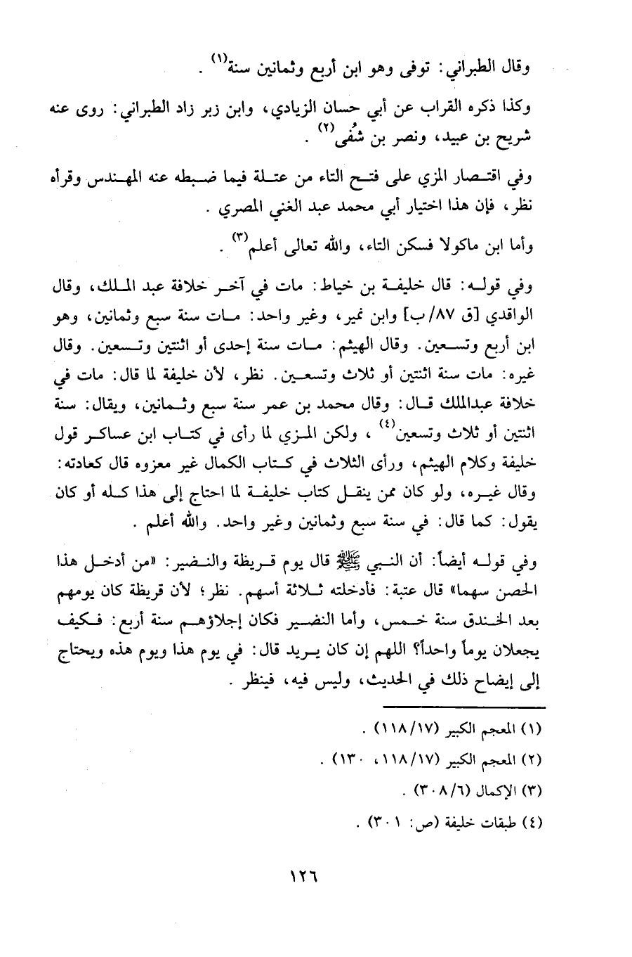 وفي قوله: قال خليفة بن خياط: مات في آخر خلافة عبد الملك، وقال الواقدي [ق ٨٧ / ب] وابن نمير، وغير واحد: مات سنة سبع وثمانين، وهو ابن أربع وتسعين. وقال الهيثم: مات سنة إحدى أو اثنتين وتسعين. وقال غيره: مات سنة اثنتين أو ثلاث وتسعين. نظر؛ لأن خليفة لما قال: مات في خلافة عبد الملك قال: وقال محمد بن عمر سنة سبع وثمانين، ويقال: سنة اثنتين أو ثلاث وتسعين، ولكن المزي لما رأى في كتاب ابن عساكر قول خليفة وكلام الهيثم، ورأى الثلاث في كتاب الكمال غير معزوه قال كعادته: وقال غيره، ولو كان ممن ينقل كتاب خليفة لما احتاج إلى هذا كله أو كان يقول: كما قال: في سنة سبع وثمانين وغير واحد. والله أعلم.