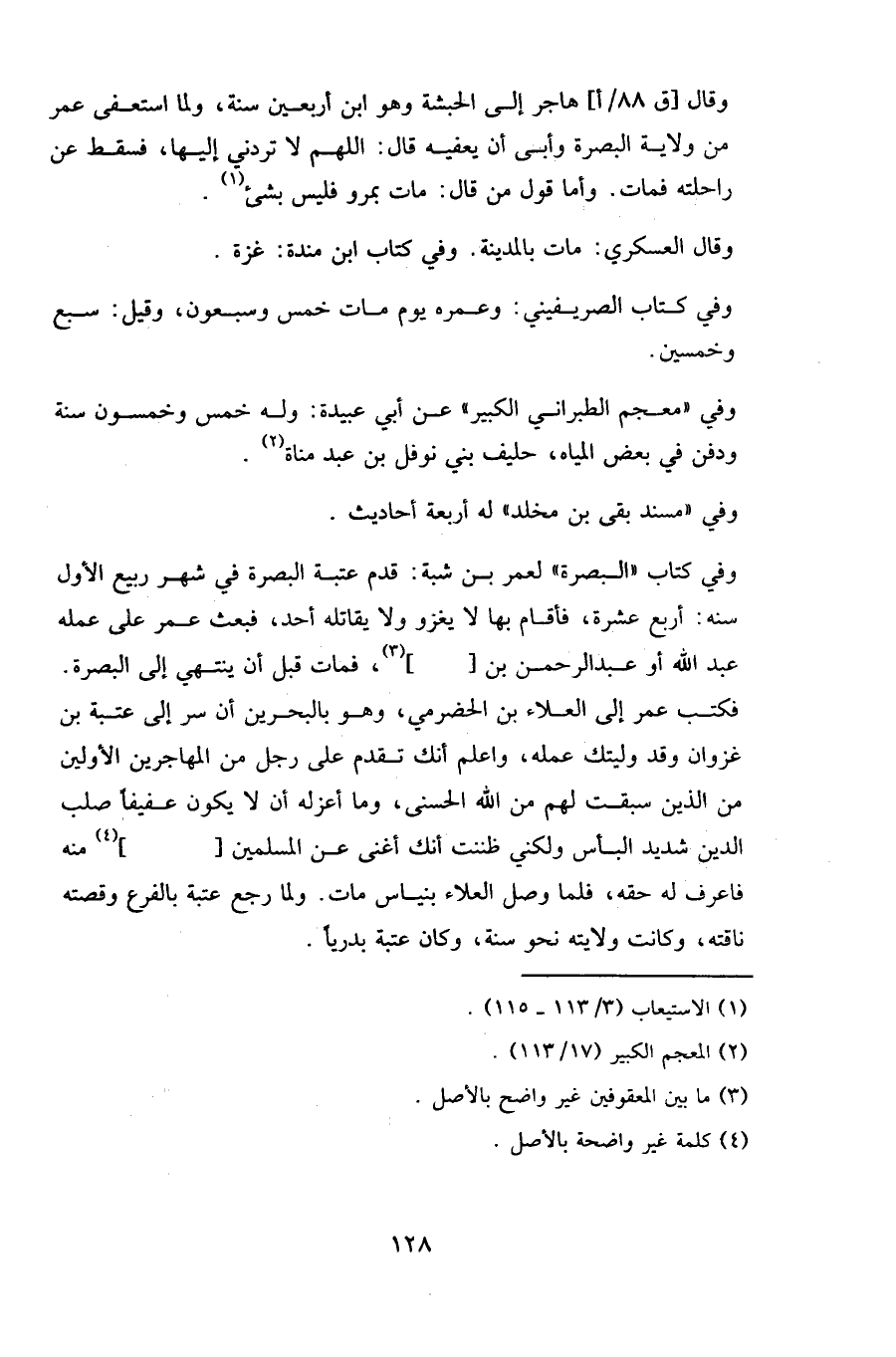وفي كتاب " البصرة " لعمر بن شبة: قدم عتبة البصرة في شهر ربيع الأول سنة: أربع عشرة، فأقام بها لا يغزو ولا يقاتله أحد، فبعث عمر على عمله عبد الله أو عبد الرحمن بن []، فمات قبل أن ينتهي إلى البصرة.