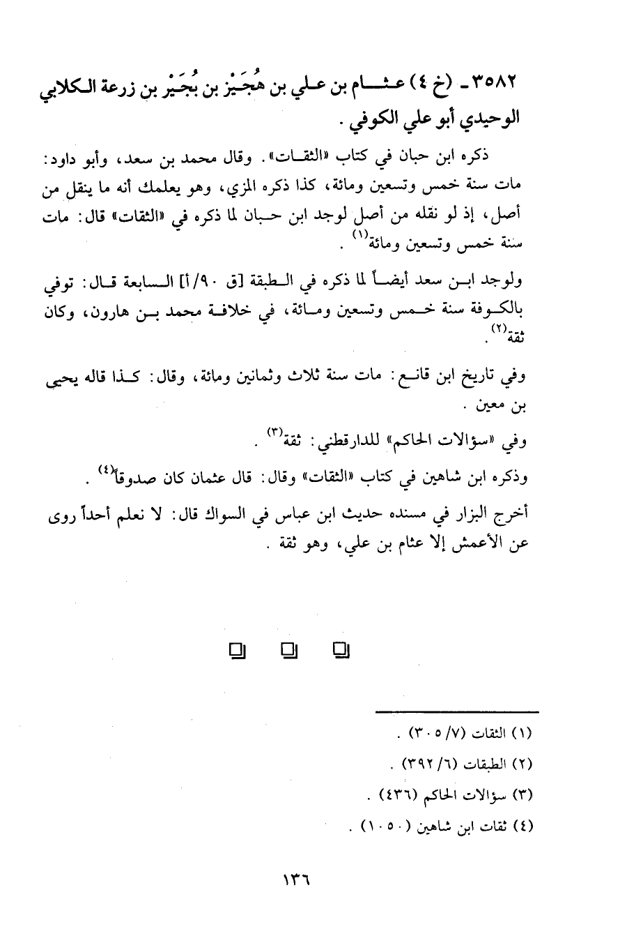 ٣٥٨٢ - (خ ٤) عثام بن علي بن هجيز بن بجير بن زرعة الكلابي الوحيدي أبو علي الكوفي.