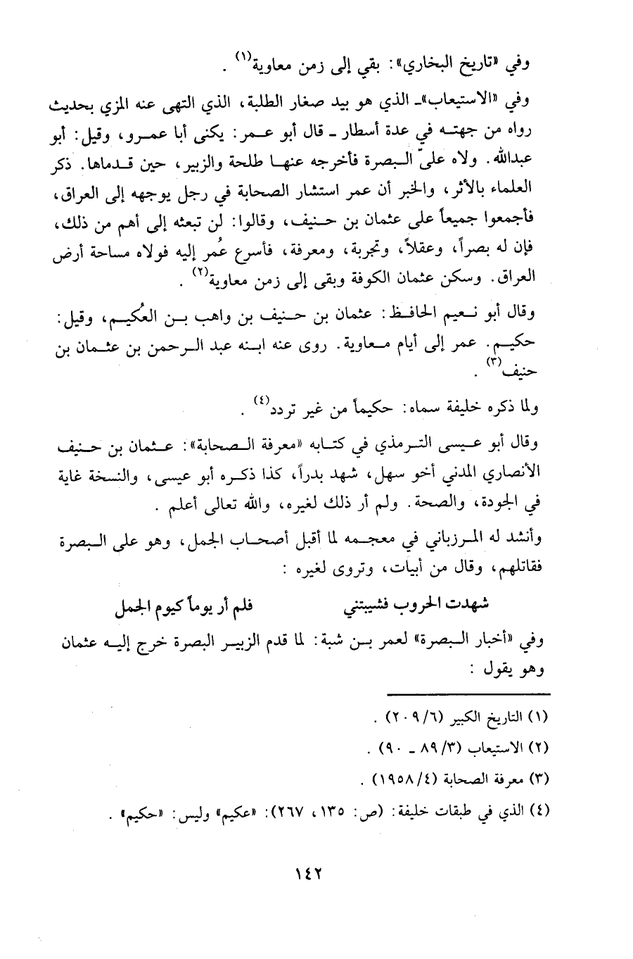 وفي " الاستيعاب " – الذي هو بيد صغار الطلبة، الذي انتهى عنه المزي بحديث رواه من جهته في عدة أسطار – قال أبو عمر: يكنى أبا عمرو، وقيل: أبو عبد الله. ولاه علي البصرة، فأخرجه عنها طلحة والزبير، حين قدماها. ذكر العلماء بالأثر، والخبر أن عمر استشار الصحابة في رجل يوجهه إلى العراق، فأجمعوا جميعا على عثمان بن حنيف، وقالوا: لن تبعثه إلى أهم من ذلك، فإن له بصرا، وعقلا، وتجربة، ومعرفة، فأسرع عمر إليه فولاه مساحة أرض العراق. وسكن عثمان الكوفة وبقي إلى زمن معاوية.