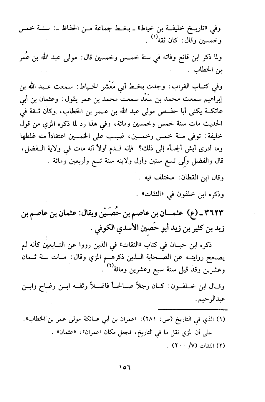 وفي كتاب القراب: وجدت بخط أبي معشر الخياط: سمعت عبد الله بن إبراهيم، سمعت محمد بن سعد، سمعت محمد بن عمر يقول " وعثمان بن أبي عاتكة يكنى أبا حفص مولى عبد الله بن عمر بن الخطاب، وكان ثقة في الحديث مات سنة خمس وخمسين ومائة، وفي هذا رد لما ذكره المزي من قول خليفة: توفي سنة خمس وخمسين، ضبب على الخمسين اعتقادا منه غلطها، وما أدري أيش ألجأه إلى ذلك؟ فإنه قدم أولا أنه مات في ولاية الفضل، قال: والفضل ولي تسع سنين وأول ولايته سنة تسع وأربعين ومائة.