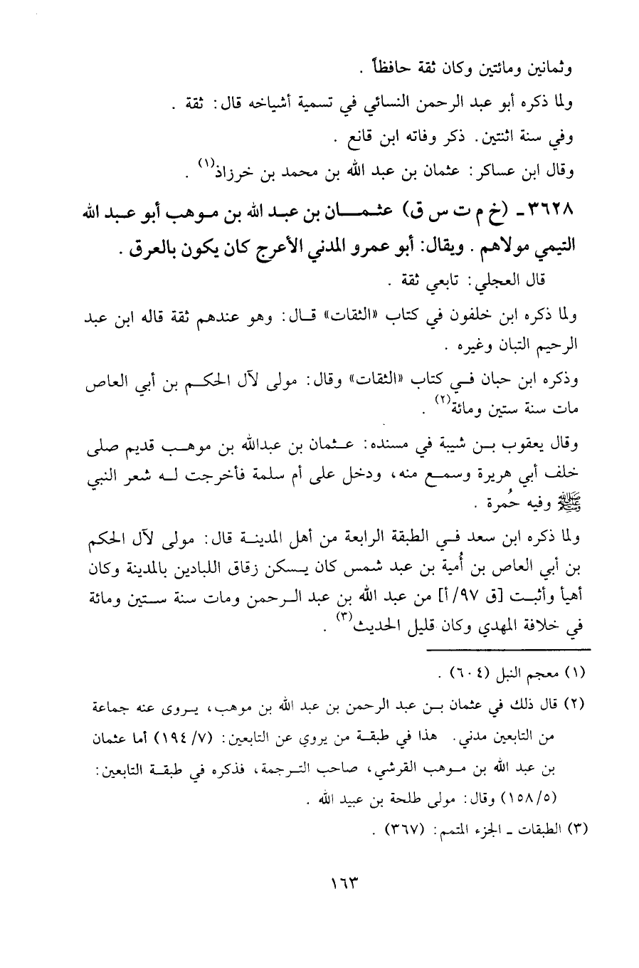 ٣٦٢٨ - (خ م ت س ق) عثمان بن عبد الله بن موهب أبو عبد الله التيمي مولاهم. ويقال: أبو عمرو المدني الأعرج كان يكون بالعرق.