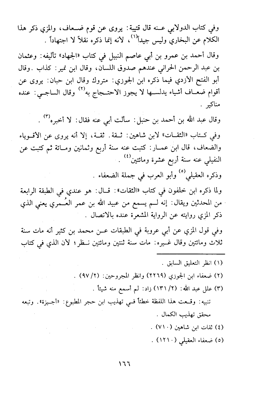 وفي كتاب الدولابي عنه، قال قتيبة: يروي عن قوم ضعاف، والمزي ذكر هذا الكلام عن البخاري وليس جيدا؛ لأنه إنما ذكره نقلا لا اجتهادا.