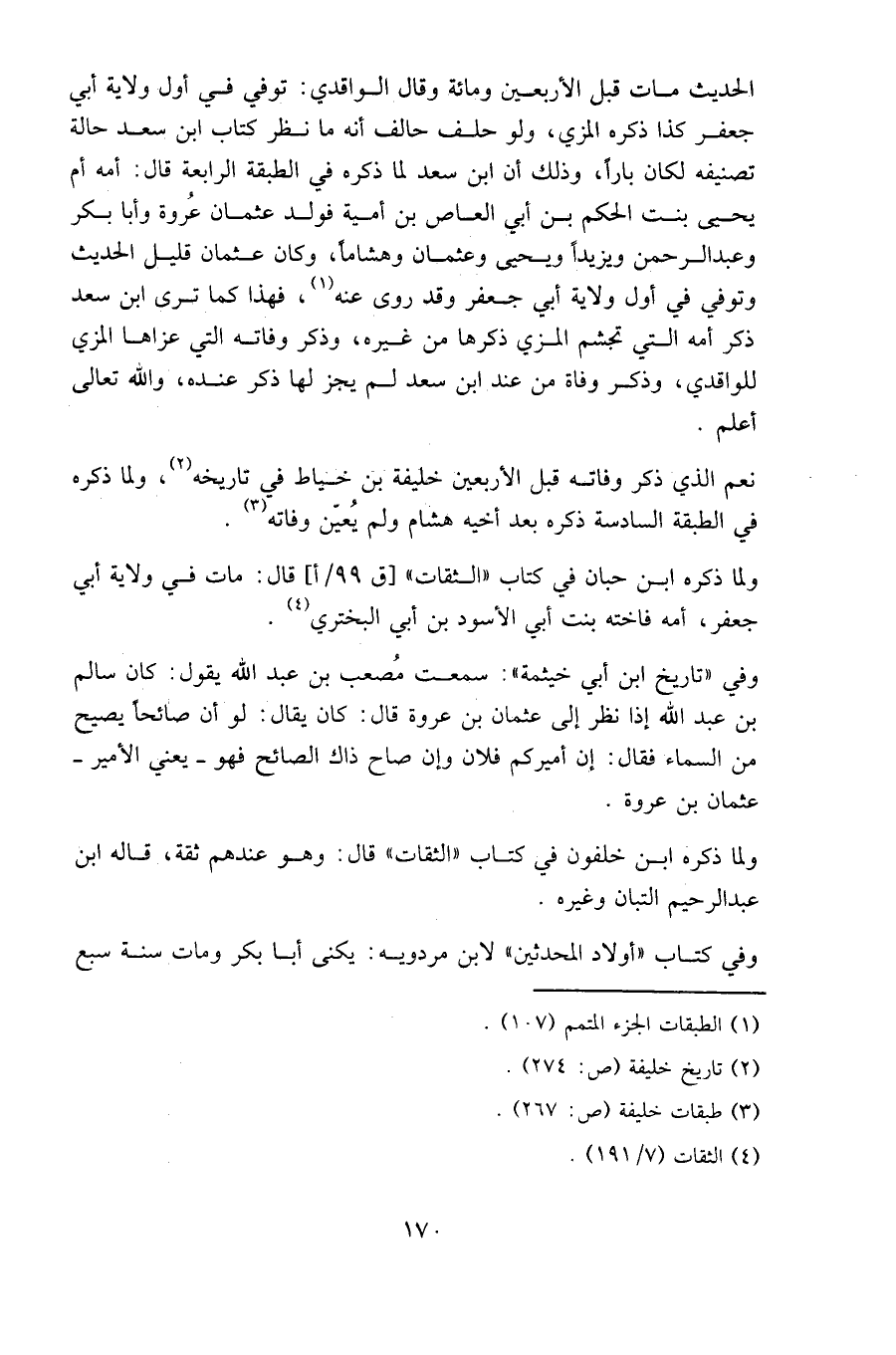 نعم الذي ذكر وفاته قبل الأربعين خليفة بن خياط في تاريخه، ولما ذكره في الطبقة السادسة ذكره بعد أخيه هشام، ولم يعين وفاته.