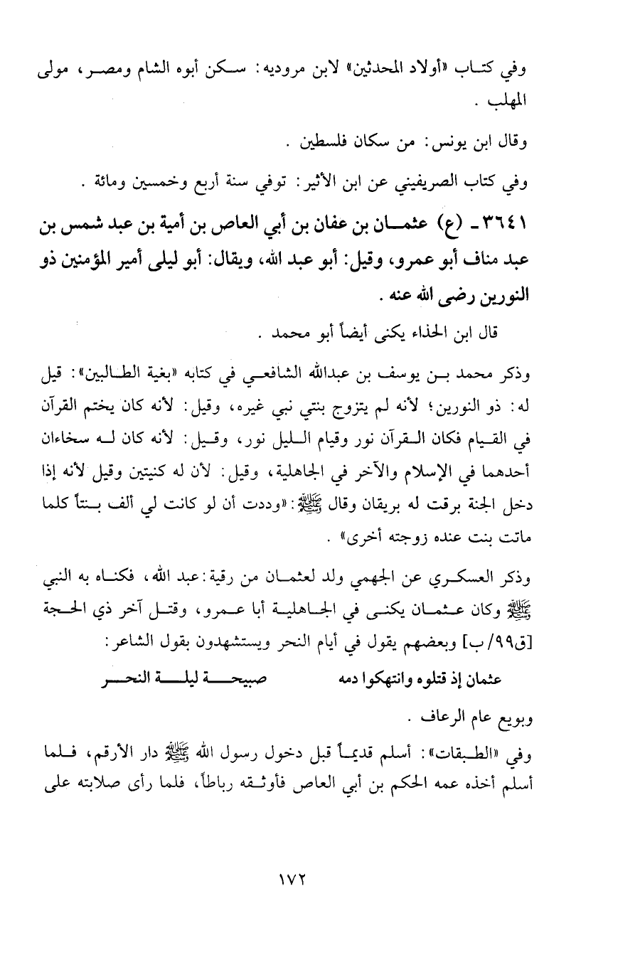 وذكر العسكري عن الجهمي ولد لعثمان من رقية: عبد الله، فكناه به النبي - صلى الله عليه وسلم - وكان عثمان يكنى في الجاهلية أبا عمرو، وقتل آخر ذي الحجة [ق ٩٩ / ب] وبعضهم يقول في أيام النحر ويستشهدون بقول الشاعر: