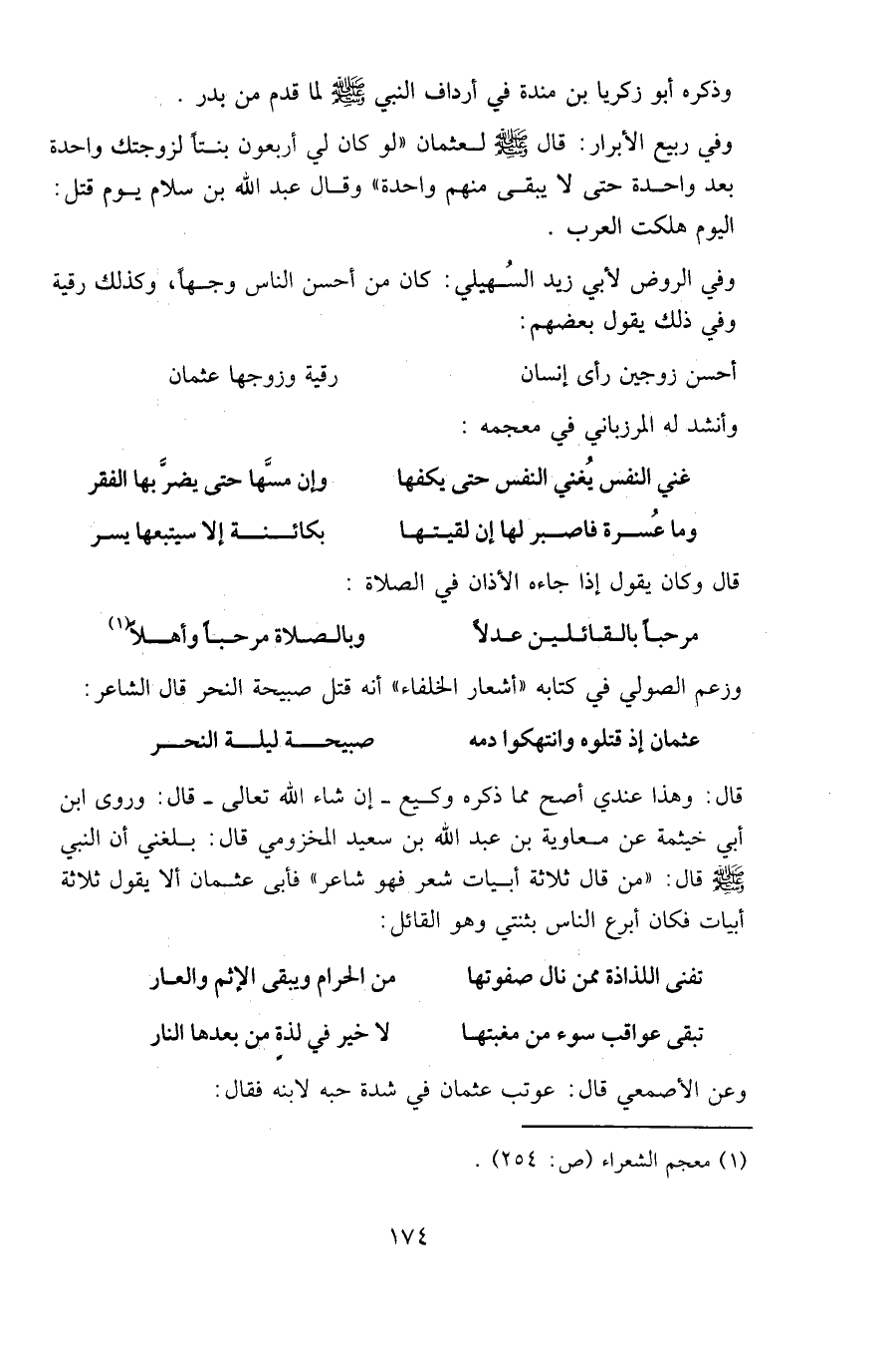 وفي ربيع الأبرار: قال - صلى الله عليه وسلم – لعثمان: " لو كان لي أربعون بنتا لزوجتك واحدة بعد واحدة حتى لا يبقى منهم واحدة "، وقال عبد الله بن سلام يوم قتل: اليوم هلكت العرب.