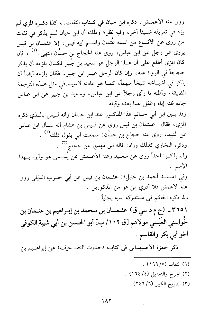 وقد بين ابن أبي حاتم هذا المذكور عند ابن حبان، وأنه ليس بالذي ذكره المزي، فقال: عثمان بن قيس روى عن قيس بن هشام، أنه سأل ابن عباس عن النبيذ، روى عنه حجاج بن حسان: سمعت أبي يقول ذلك.