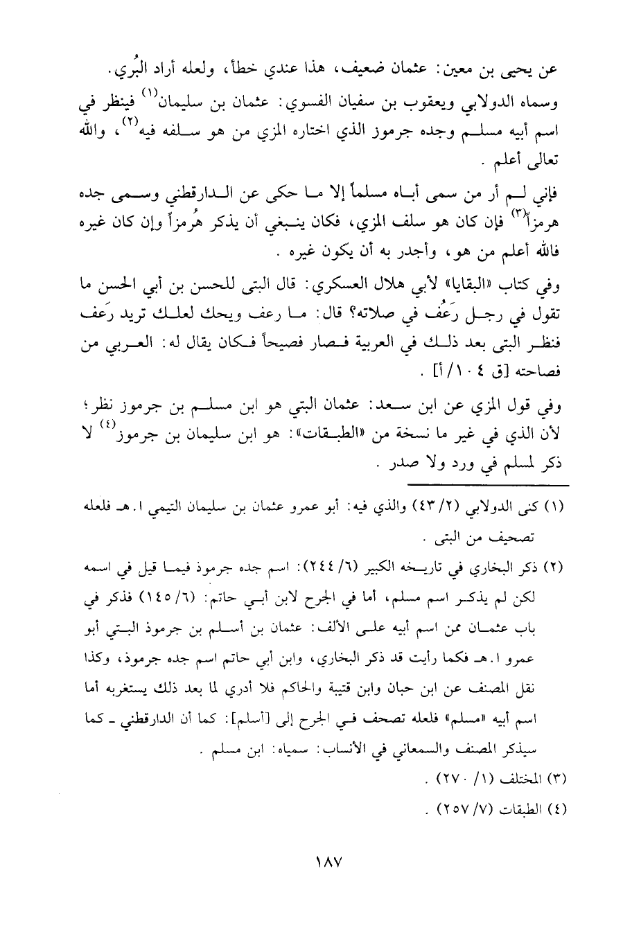 وفي قول المزي عن ابن سعد: عثمان البتي هو ابن مسلم بن جرموز نظر؛ لأن الذي في غير ما نسخة من " الطبقات ": هو ابن سليمان بن جرموز لا ذكر لمسلم في ورد ولا صدر.