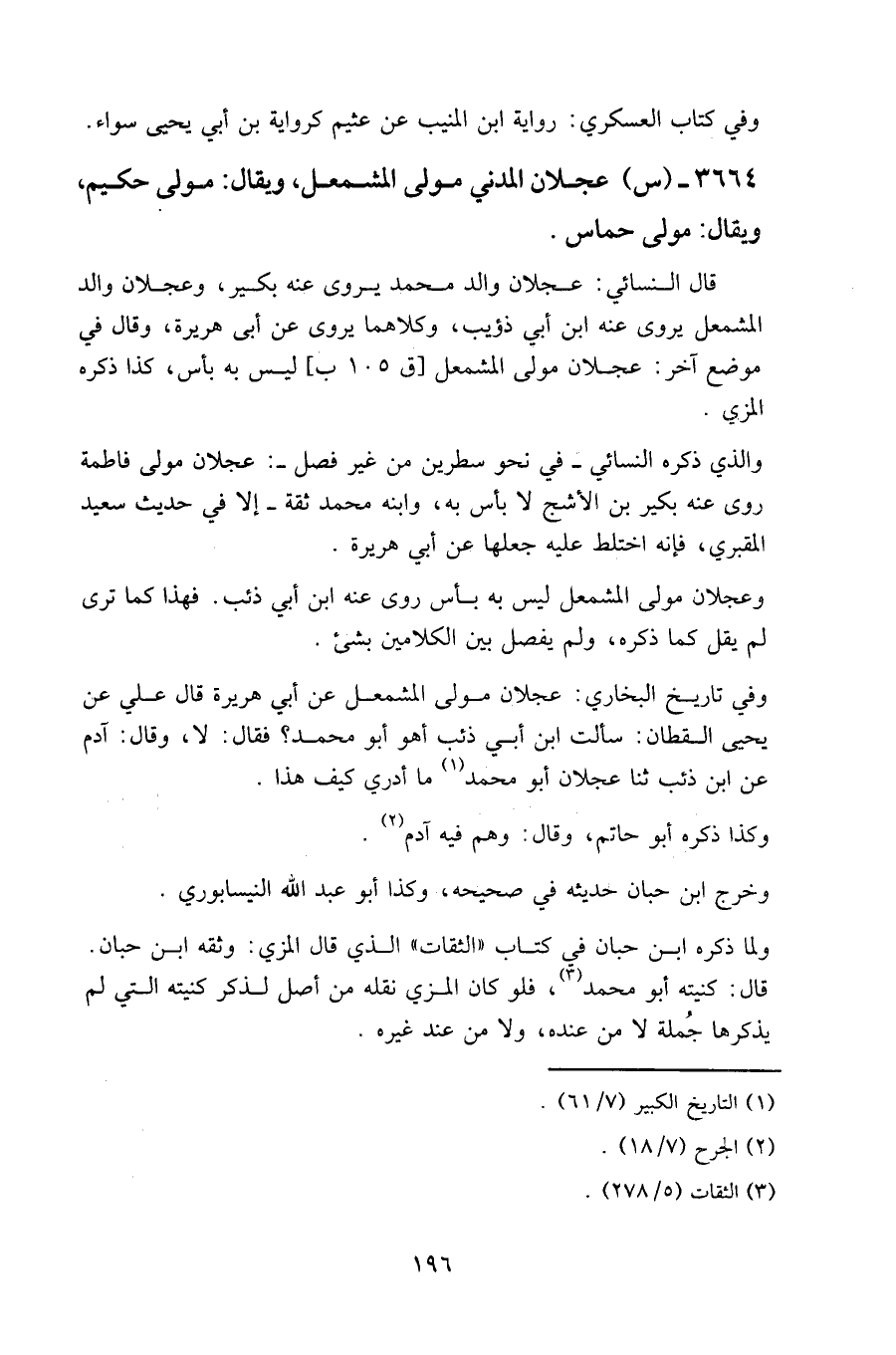 ٣٦٦٤ - (س) عجلان المدني مولى المشمعل، ويقال: مولى حكيم، ويقال: مولى حماس.