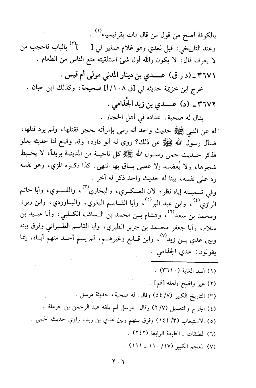 وفي تسميته إياه نظر؛ لأن العسكري، والبخاري، والفسوي، وأبا حاتم الرازي، وابن عبد البر، وأبا القاسم البغوي، والباوردي، وابن زبر، ومحمد بن سعد، وهشام بن محمد بن السائب الكلبي، وأبا عبيد بن سلام، وأبا جعفر محمد بن جرير الطبري، وأبا القاسم الطبراني وفرق بينه وبين عدي بن زيد، وابن قانع وغيرهم، لم يسم أحد منهم أباه، إنما يقولون: عدي الجذامي.
