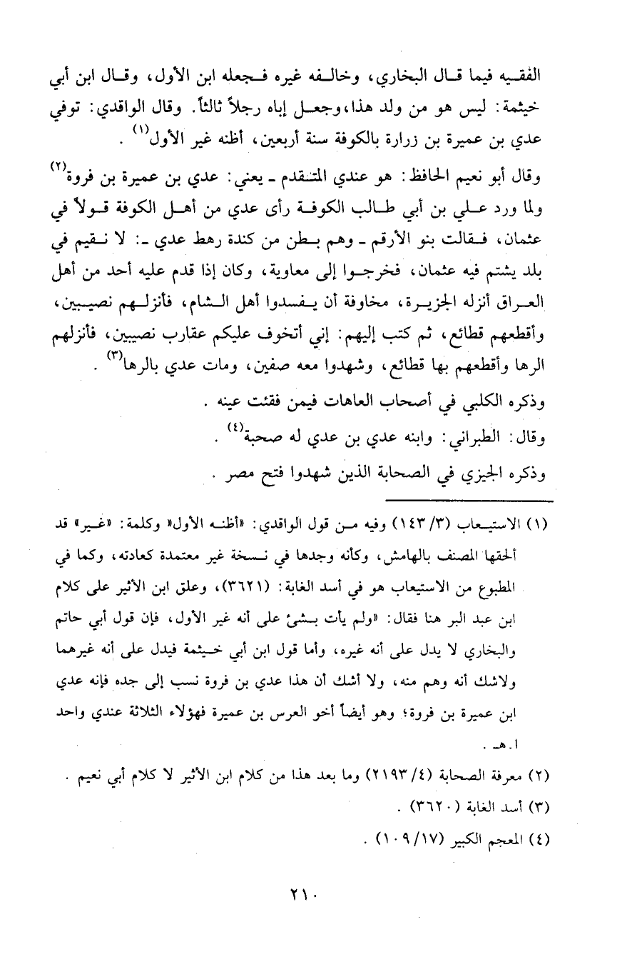 الفقيه فيما قال البخاري، وخالفه غيره فجعله ابن الأول، وقال ابن أبي خيثمة: ليس هو من ولد هذا، وجعل أباه رجلا ثالثا. وقال الواقدي: توفي عدي بن عميرة بن زرارة بالكوفة سنة أربعين، أظنه غير الأول.