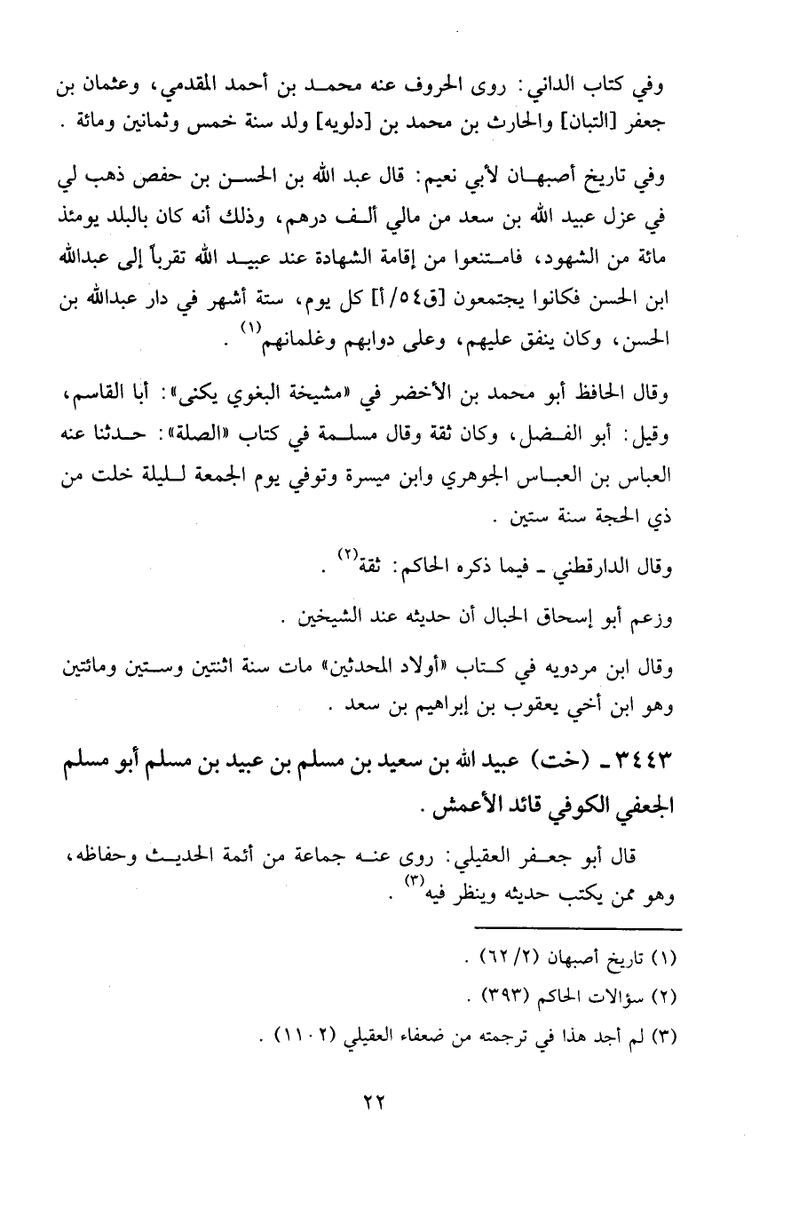 وفي تاريخ أصبهان لأبي نعيم: قال عبد الله بن الحسن بن حفص ذهب لي في عزل عبيد الله بن سعد من مالي ألف درهم، وذلك أنه كان بالبلد يومئذ مائة من الشهود، فامتنعوا من إقامة الشهادة عند عبيد الله تقربا إلى عبد الله بن الحسن، فكانوا يجتمعون [ق ٥٤ / أ] كل يوم، ستة أشهر في دار عبد الله بن الحسن، وكان ينفق عليهم، وعلى دوابهم وغلمانهم.