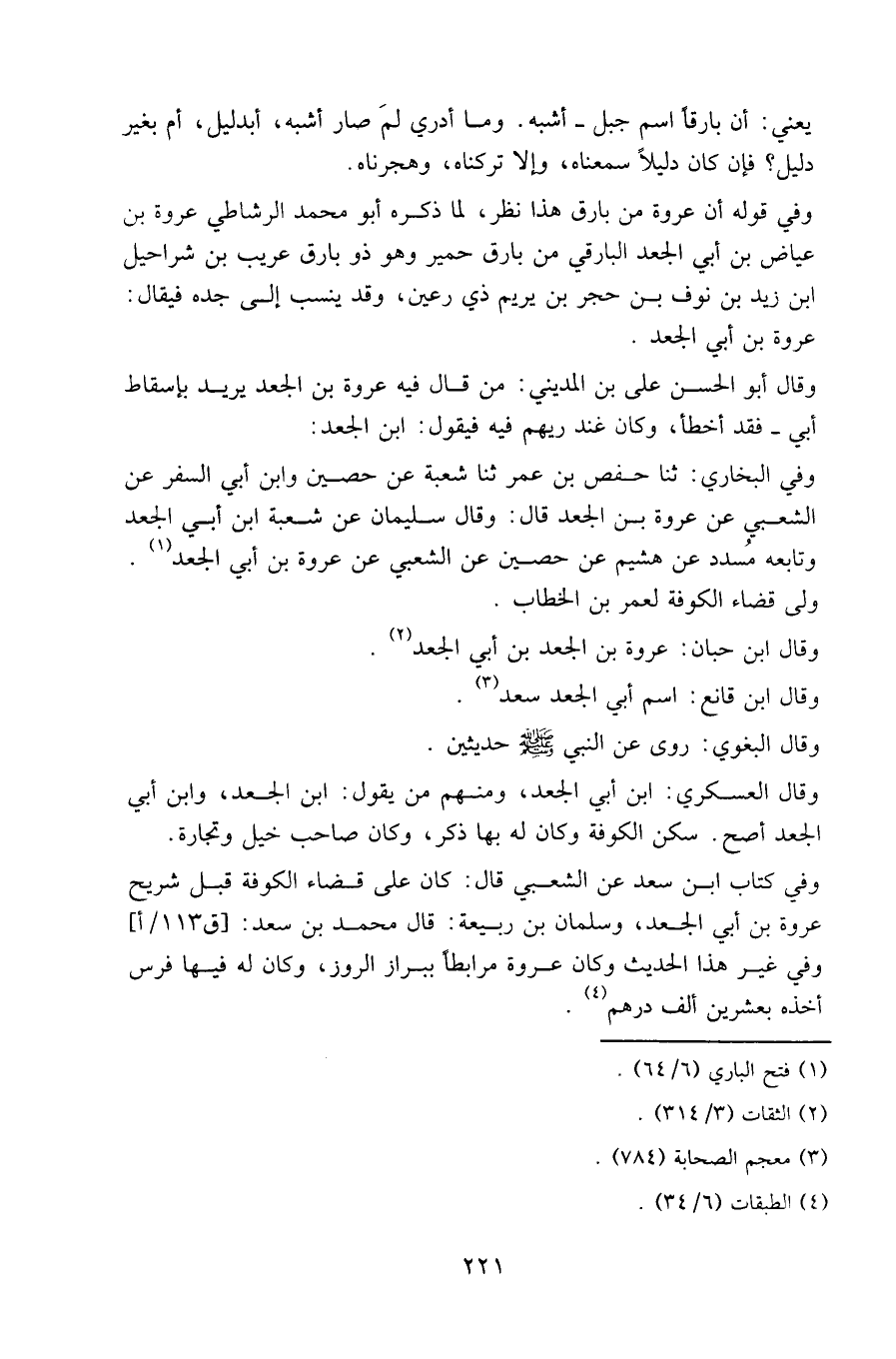 وفي قوله: أن عروة من بارق هذا نظر، لما ذكره أبو محمد الرشاطي عروة بن عياض بن أبي الجعد البارقي من بارق حمير وهو ذو بارق عريب بن شراحيل بن زيد بن نوف بن حجر بن يريم ذي رعين، وقد ينسب إلى جده فيقال: عروة بن أبي الجعد.