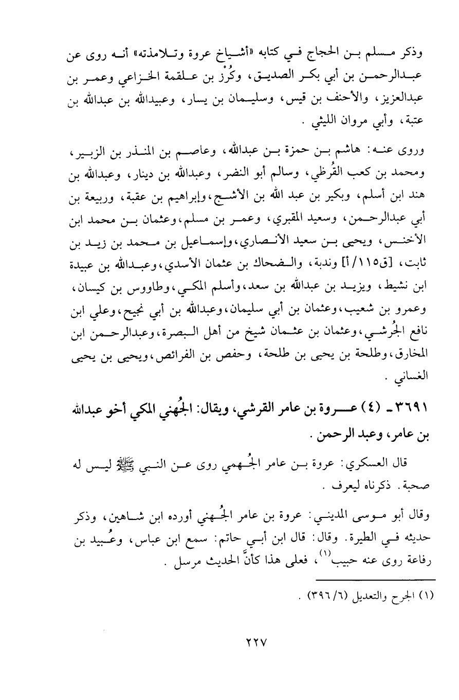 ٣٦٩١ - (٤) عروة بن عامر القرشي، ويقال: الجهني المكي أخو عبد الله بن عامر، وعبد الرحمن.