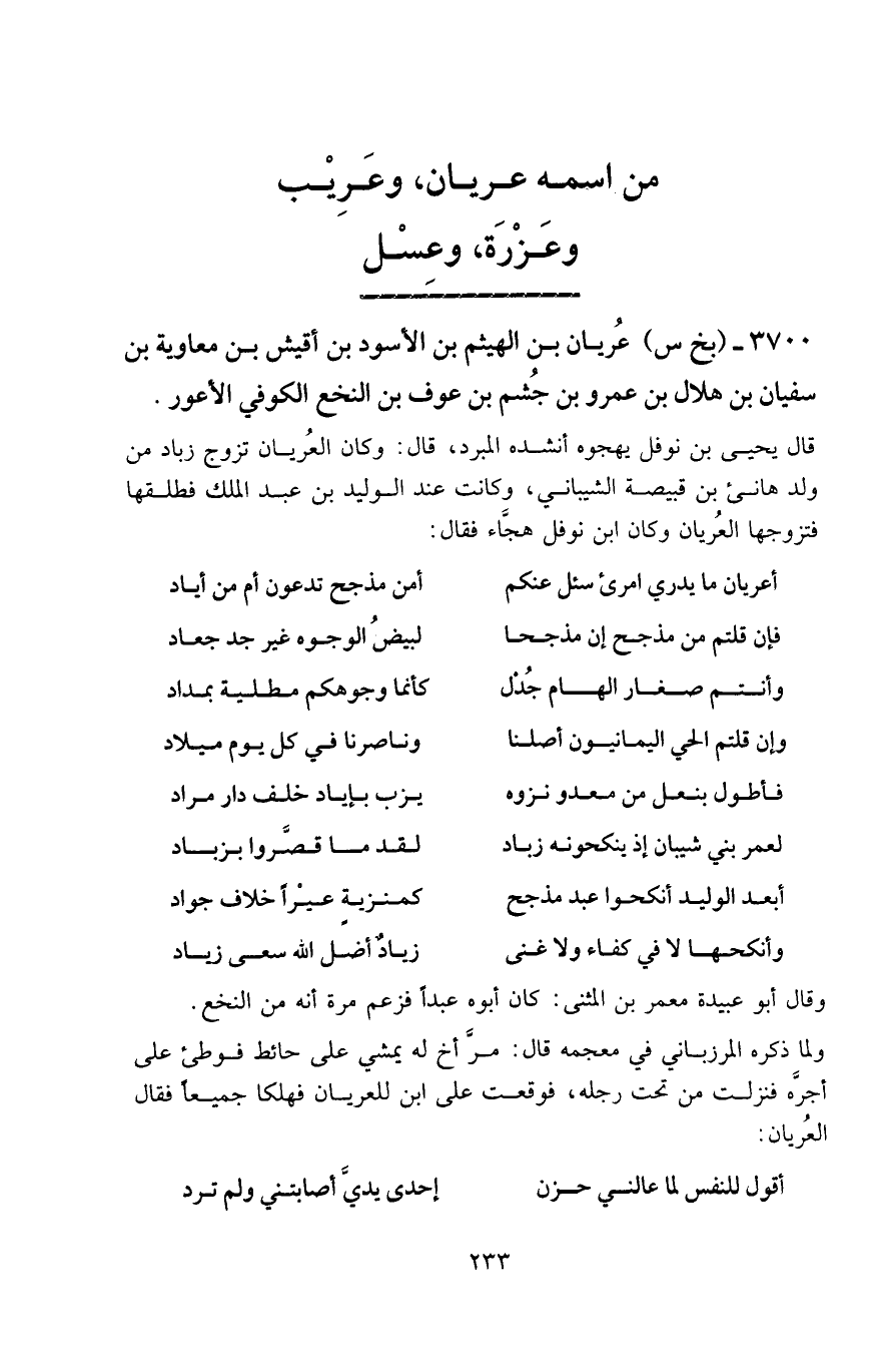 ولما ذكره المرزباني في معجمه قال: مر أخ له يمشي على حائط، فوطئ على أجره فنزلت من تحت رجله، فوقعت على ابن للعريان فهلكا جميعا فقال العريان: