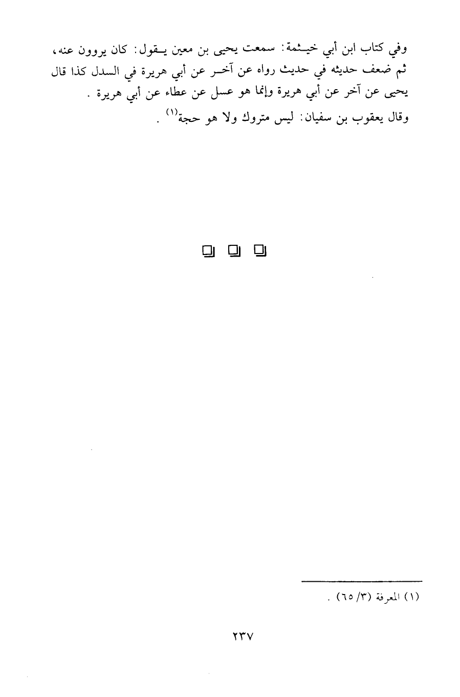 وفي كتاب ابن أبي خيثمة: سمعت يحيى بن معين يقول: كان يروون عنه، ثم ضعف حديثه في حديث رواه عن آخر عن أبي هريرة في السدل كذا قال يحيى عن آخر عن أبي هريرة، وإنما هو عسل عن عطاء عن أبي هريرة.